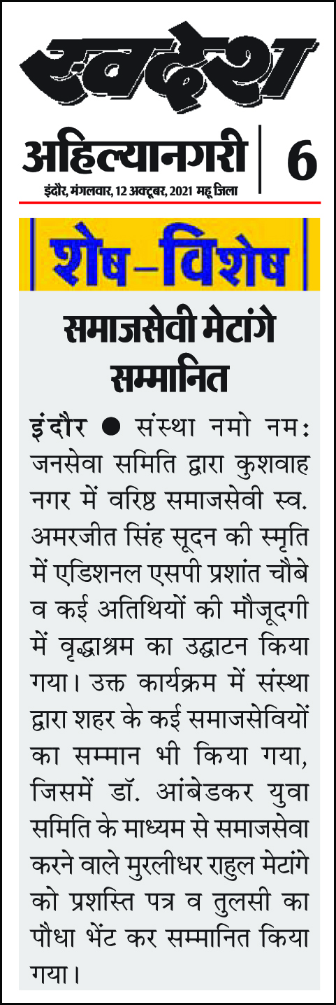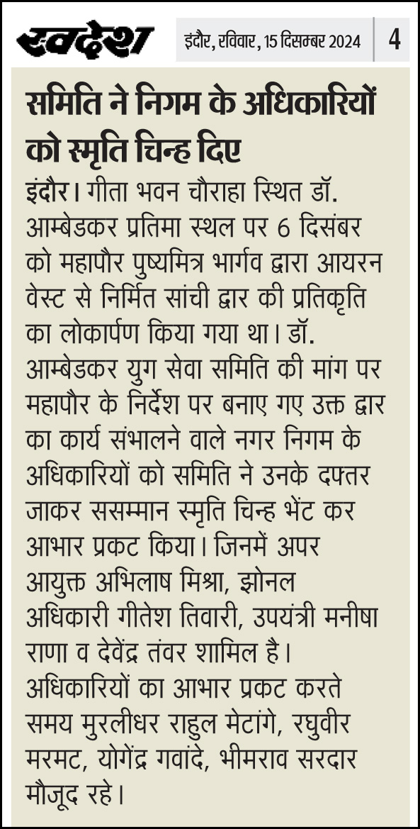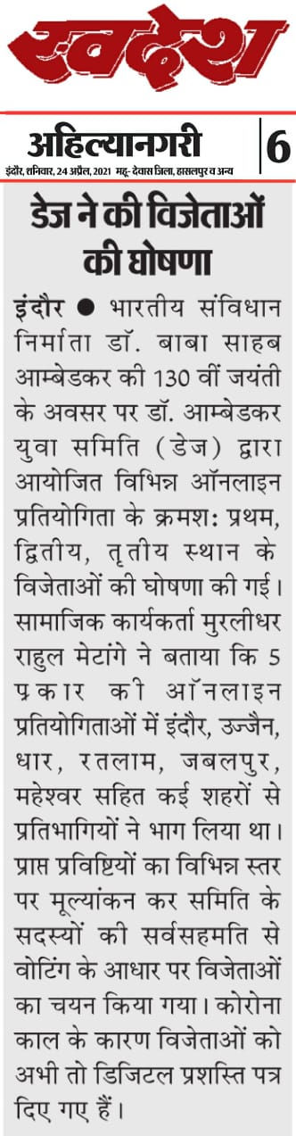 डॉ. अम्बेडकर युग सेवा समिति (DAYS), इंदौर – म.प्र. एक सामाजिक संगठन है, जिसका गठन अप्रैल 2016 में किया गया । समाजसेवा के क्षेत्र में समिति अपनी एक अलग पहचान रखती है | गठन के समय समिति का नाम “डॉ. अम्बेडकर युवा समिति (DAYS)” रखा गया एवं 14 अप्रैल 2023 में समिति का नाम परिवर्तन करके “डॉ. अम्बेडकर युग सेवा समिति (DAYS)” किया गया ।