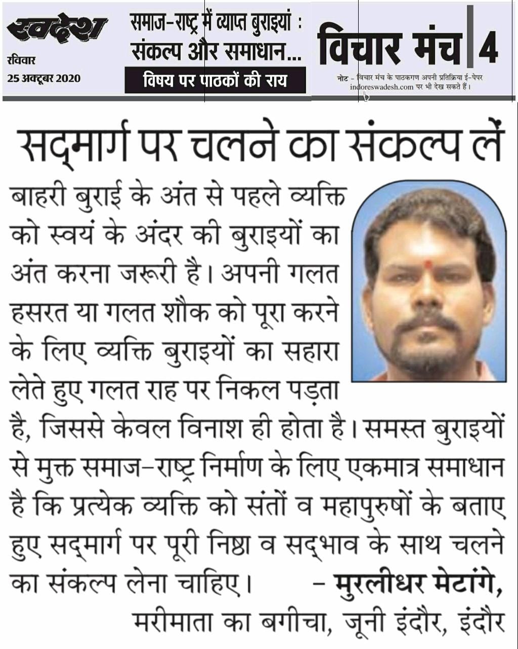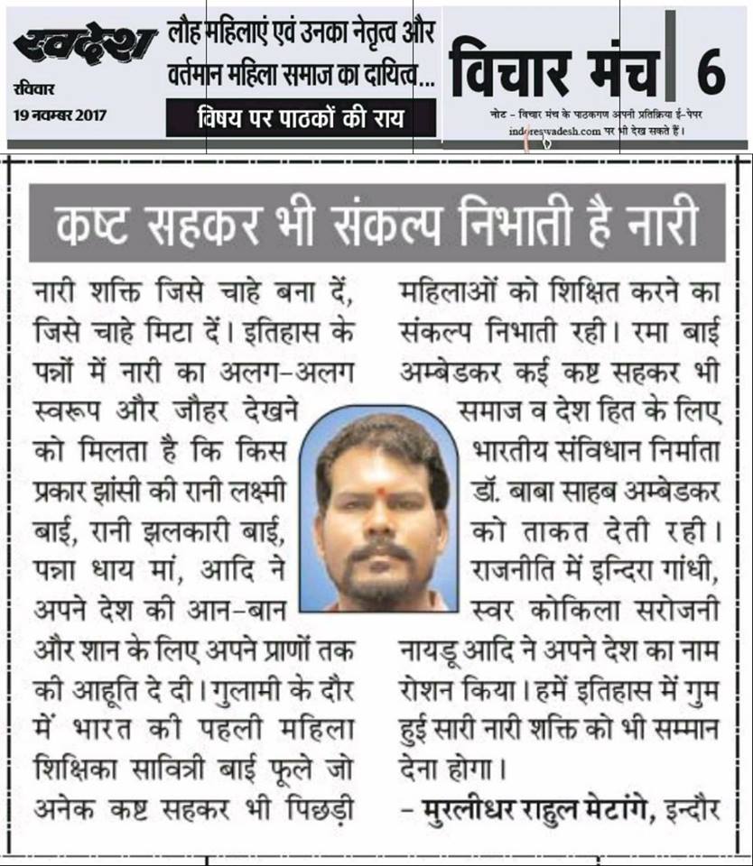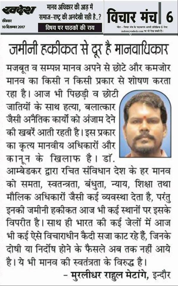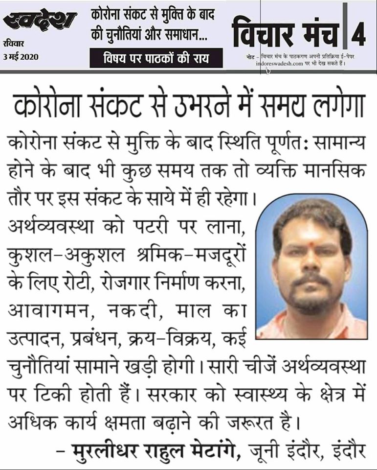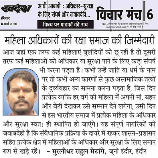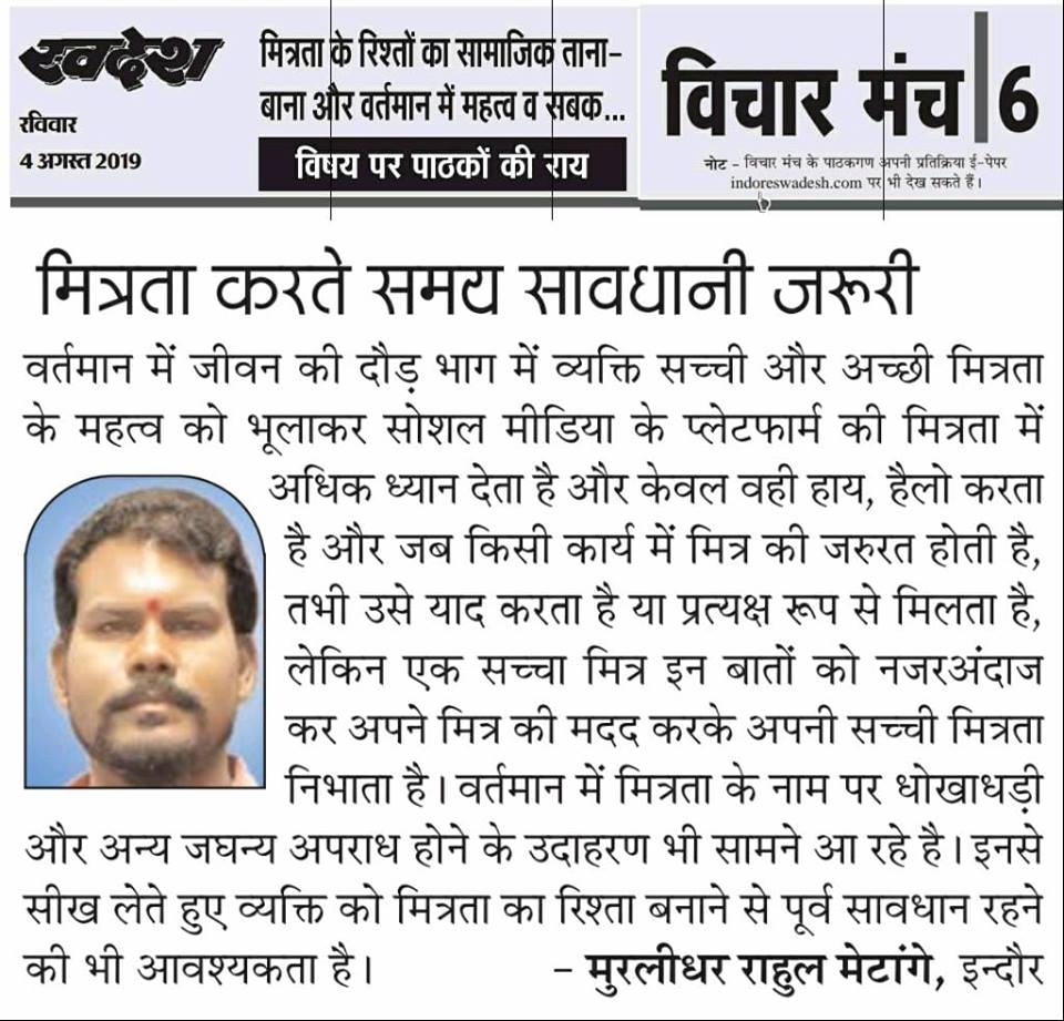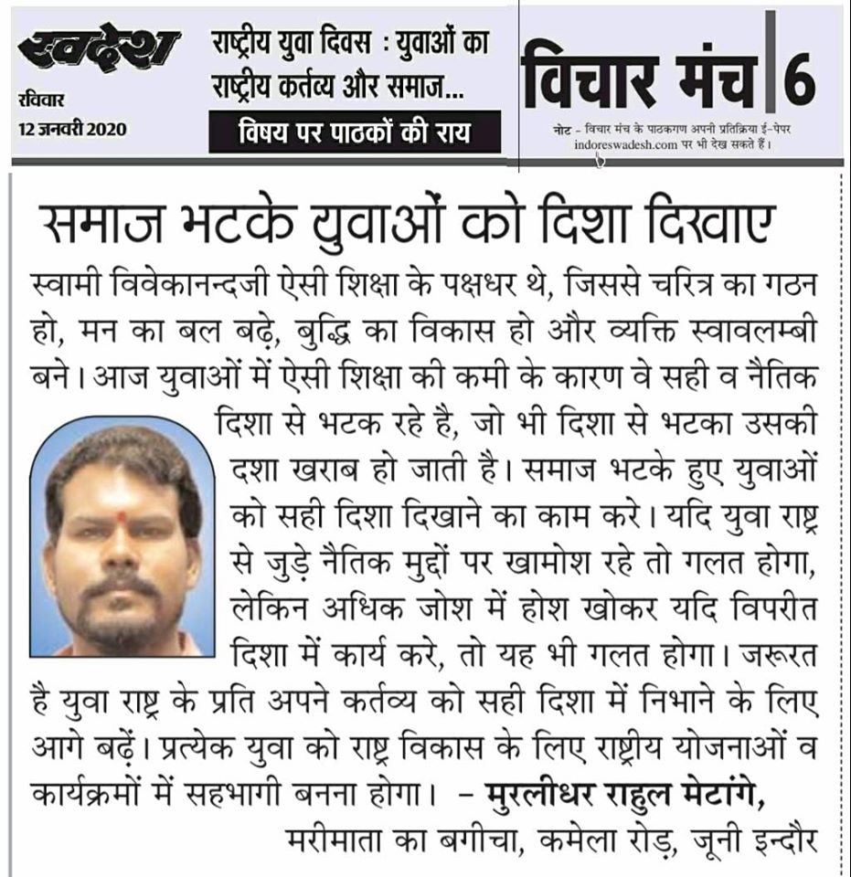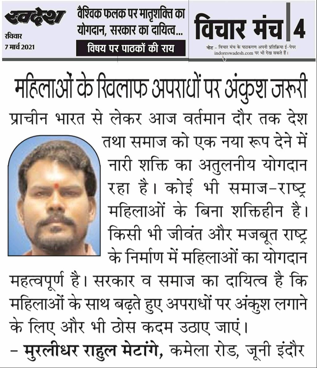 स्वदेश न्यूज़ पेपर में प्रति सप्ताह अलग-अलग विषयों पर सामाजिक कार्यकर्ता मुरलीधर राहुल मेटांगे द्वारा अपने विचार प्रकट किये गए । जो इस प्रकार है ।
