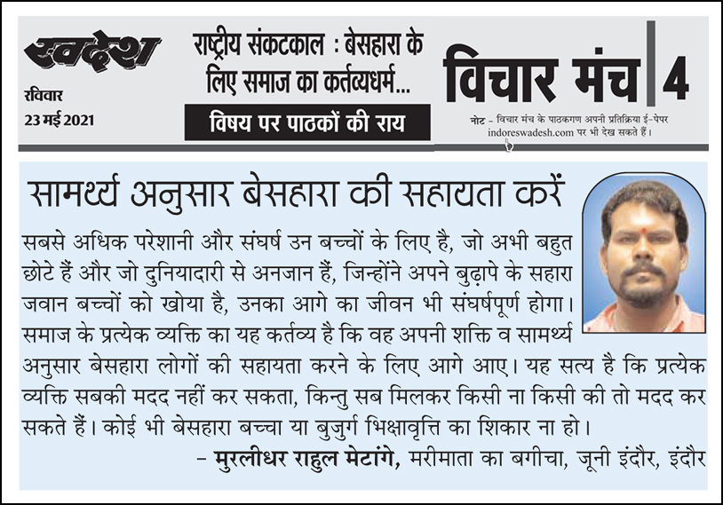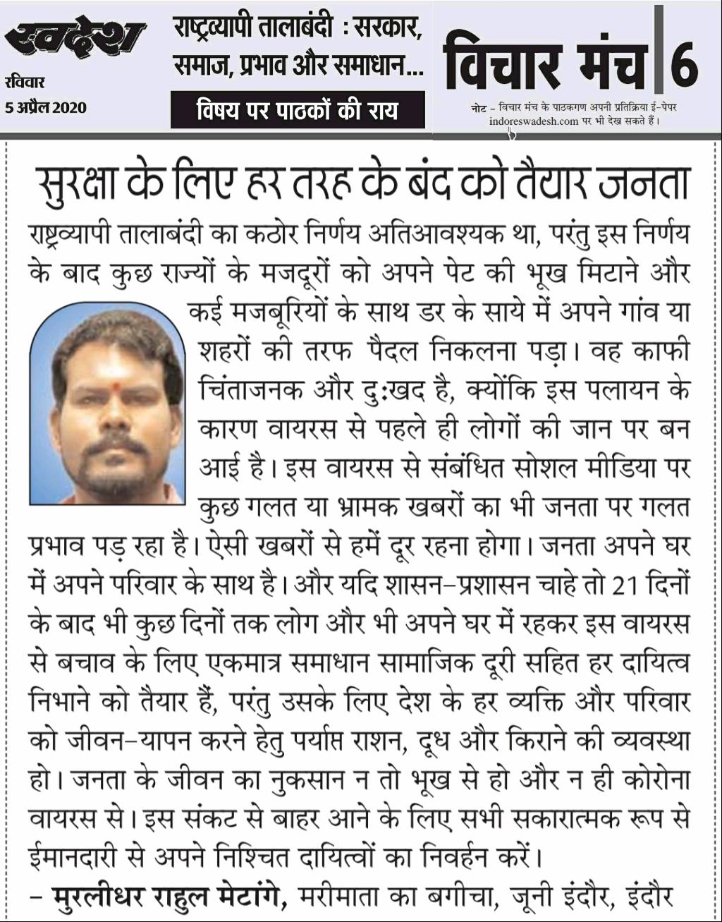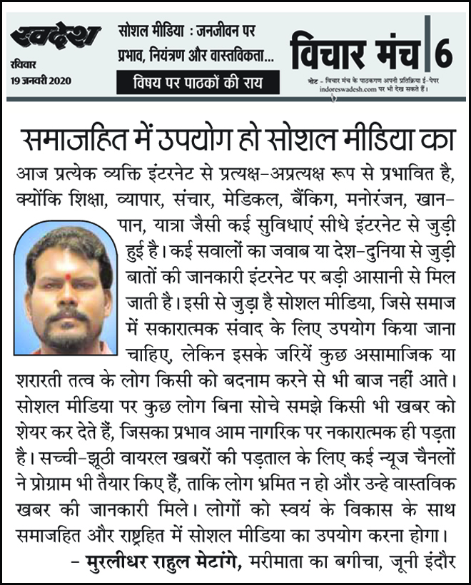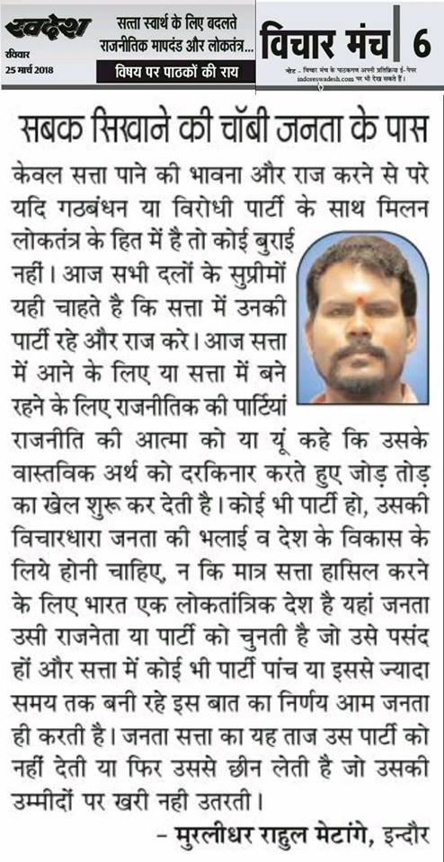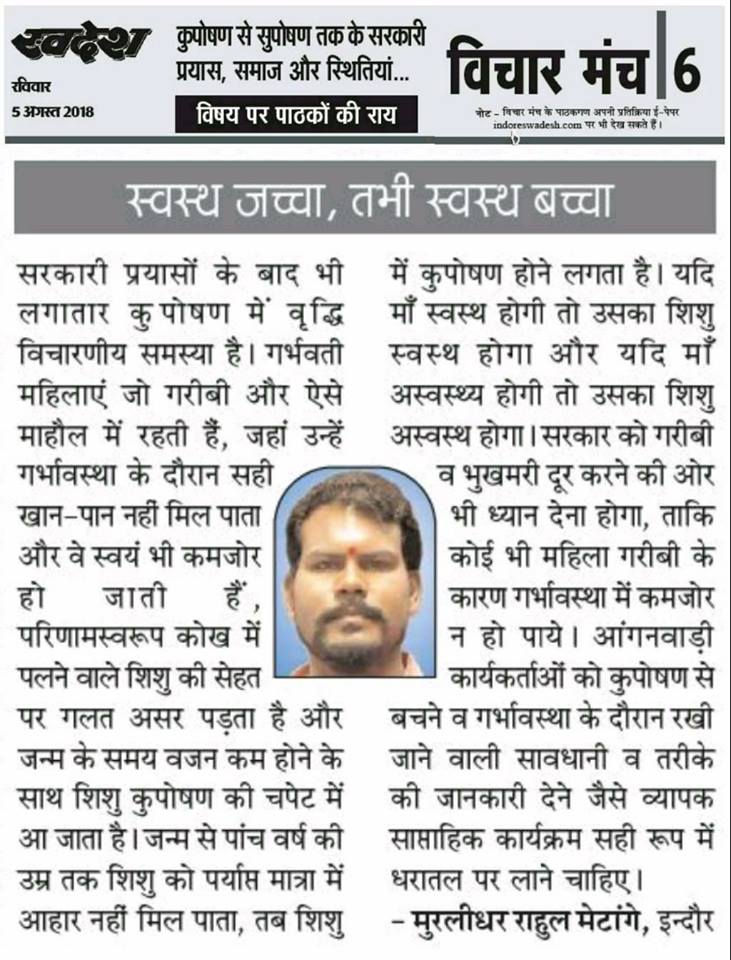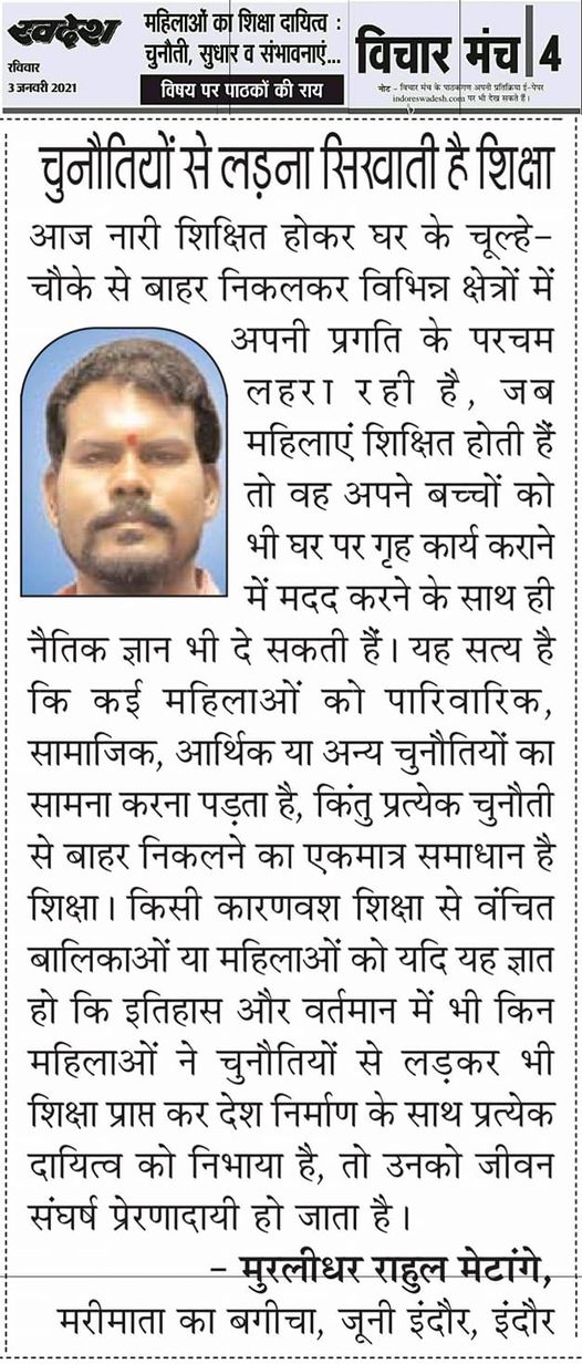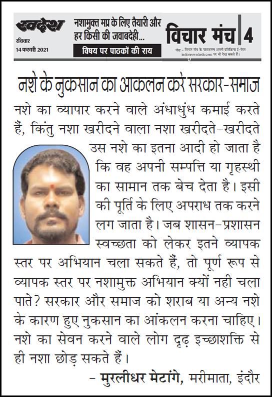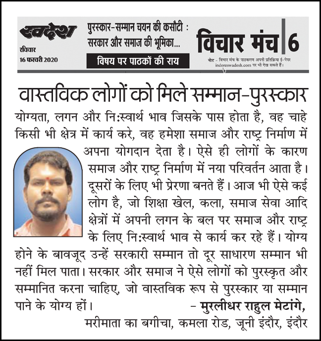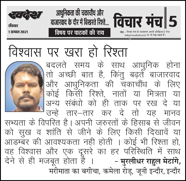 स्वदेश न्यूज़ पेपर में प्रति सप्ताह अलग-अलग विषयों पर सामाजिक कार्यकर्ता मुरलीधर राहुल मेटांगे द्वारा अपने विचार प्रकट किये गए । जो इस प्रकार है ।
