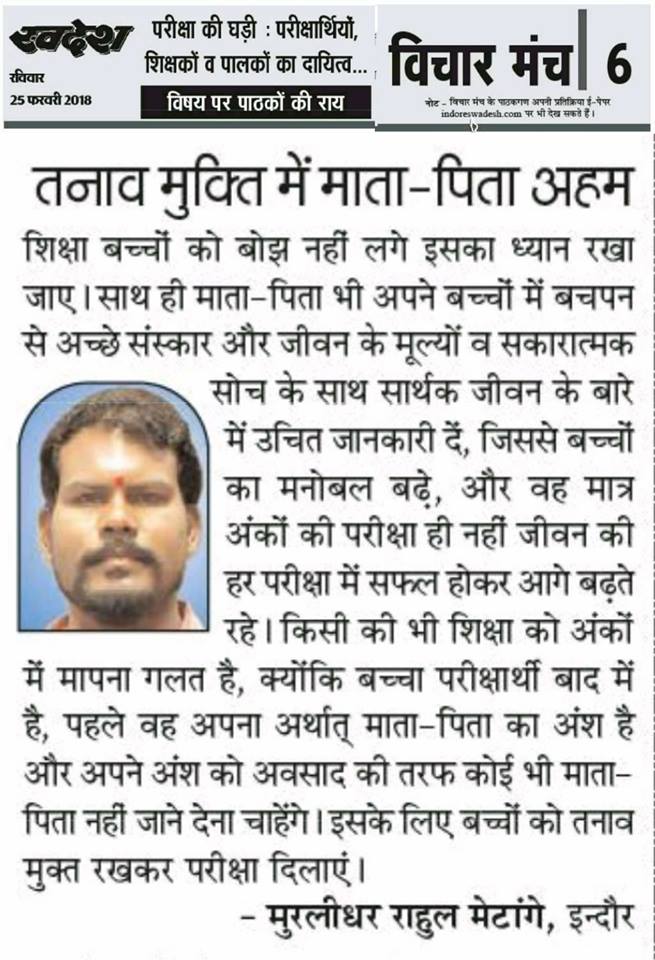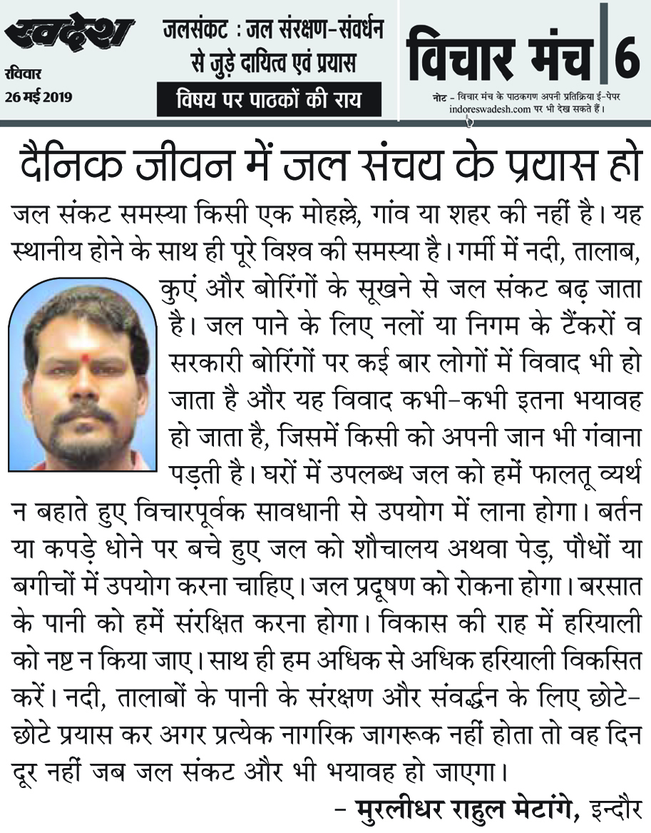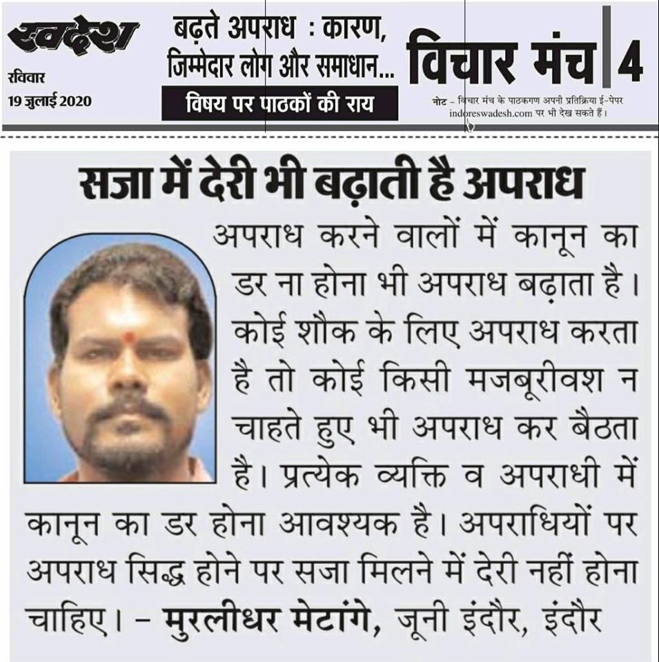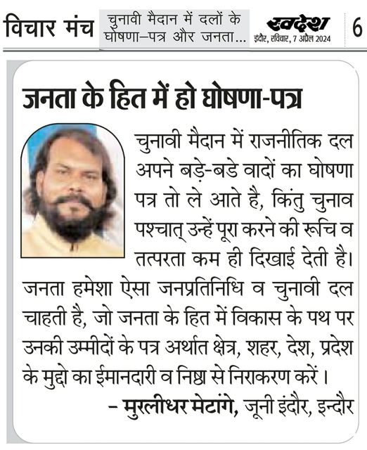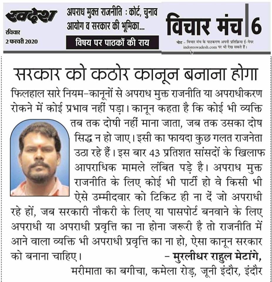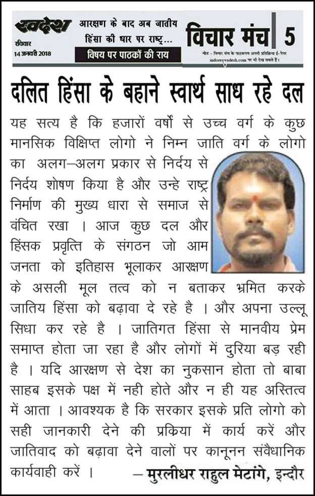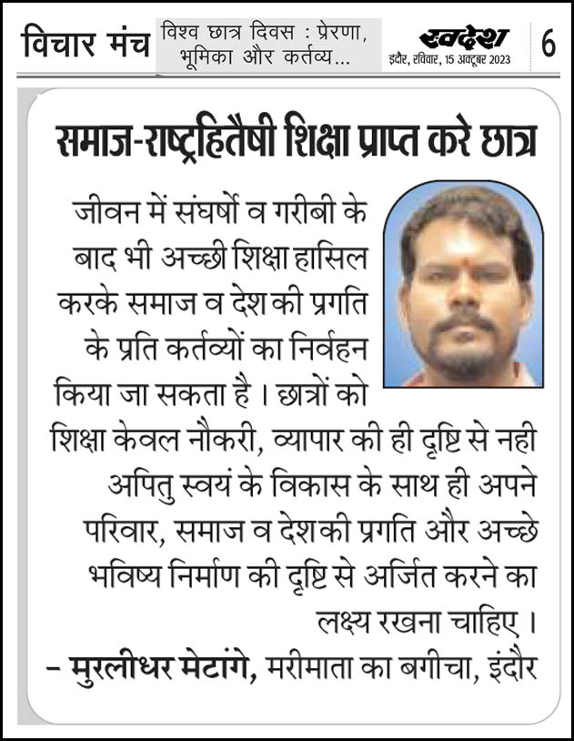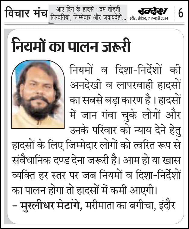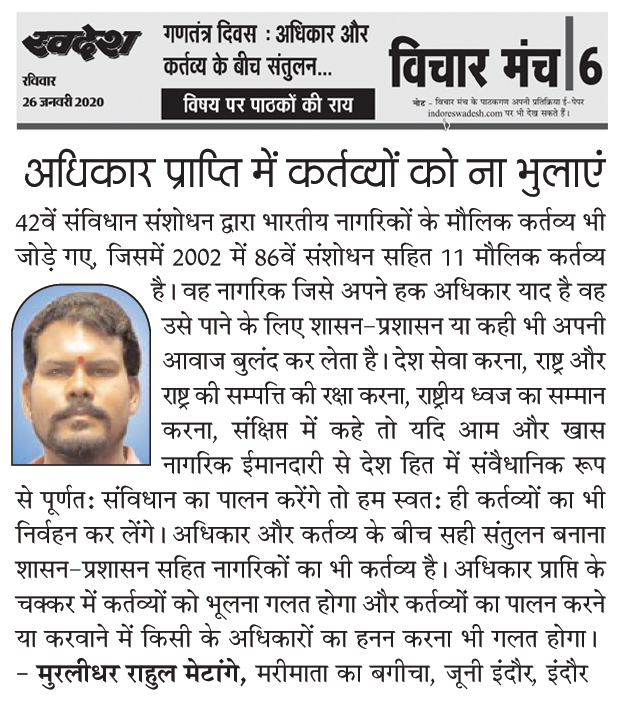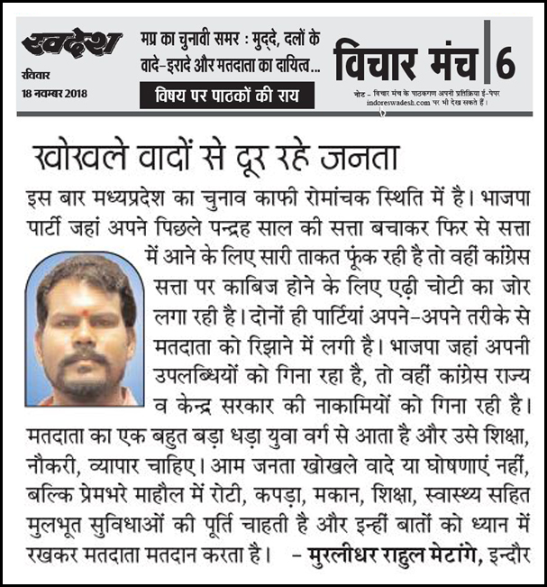 स्वदेश न्यूज़ पेपर में प्रति सप्ताह अलग-अलग विषयों पर सामाजिक कार्यकर्ता मुरलीधर राहुल मेटांगे द्वारा अपने विचार प्रकट किये गए । जो इस प्रकार है ।