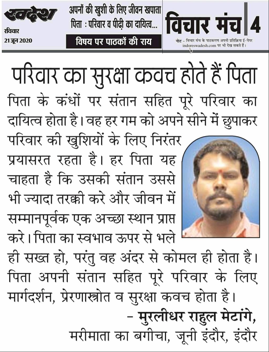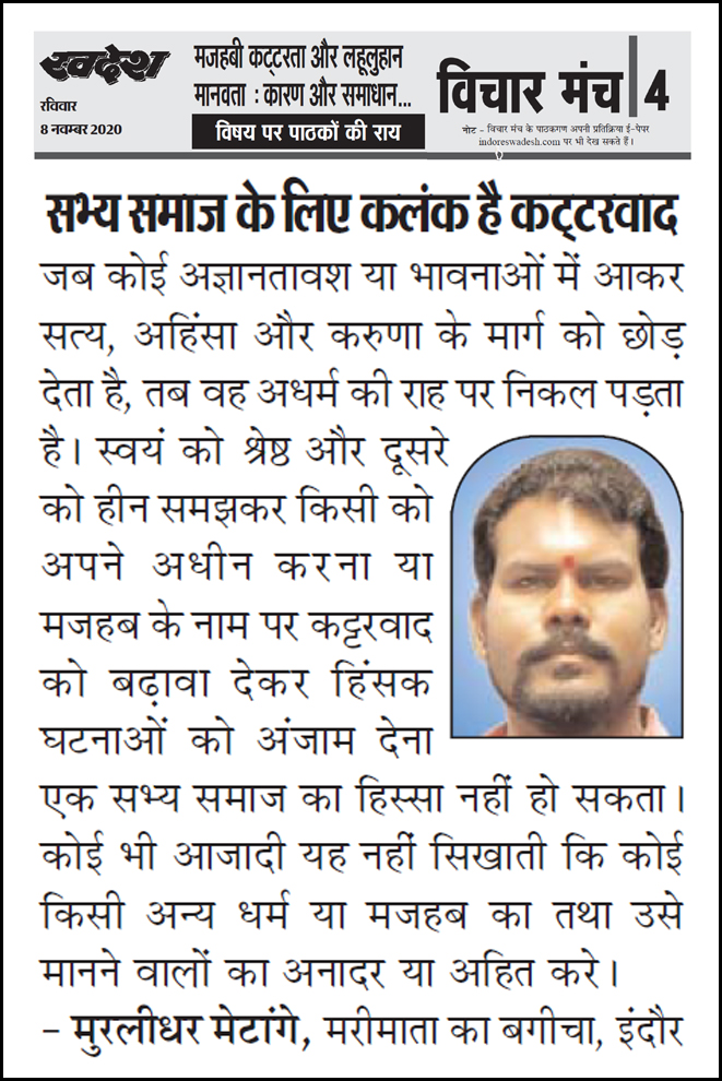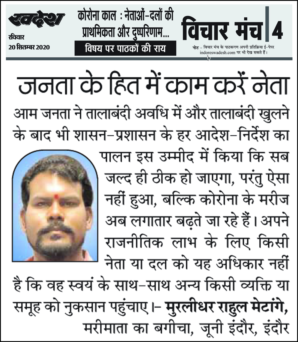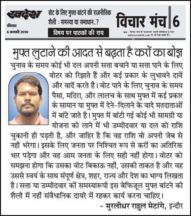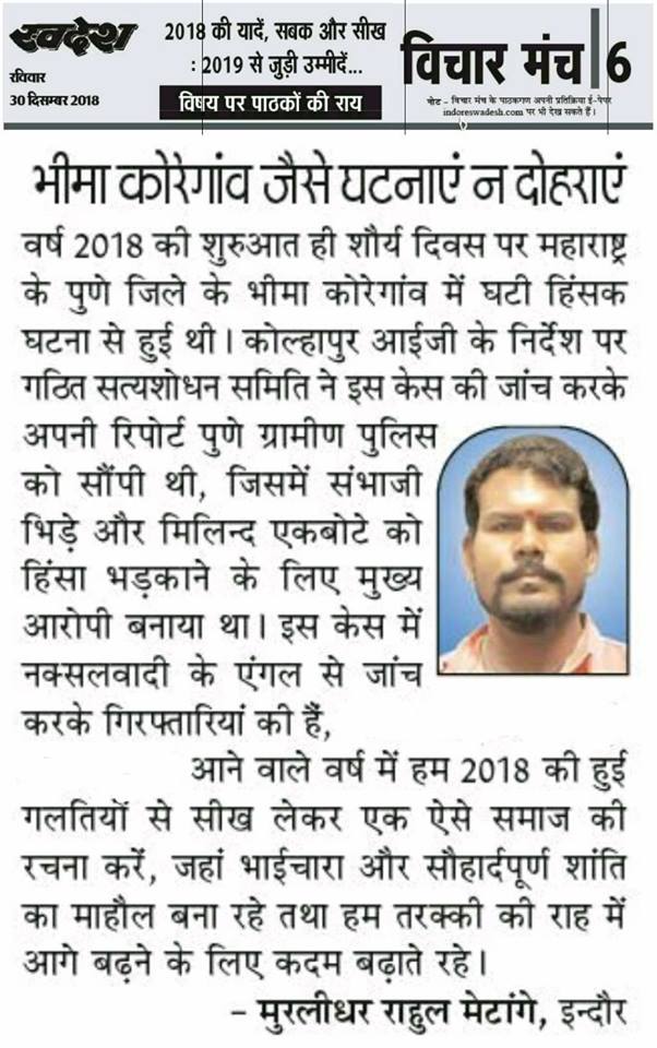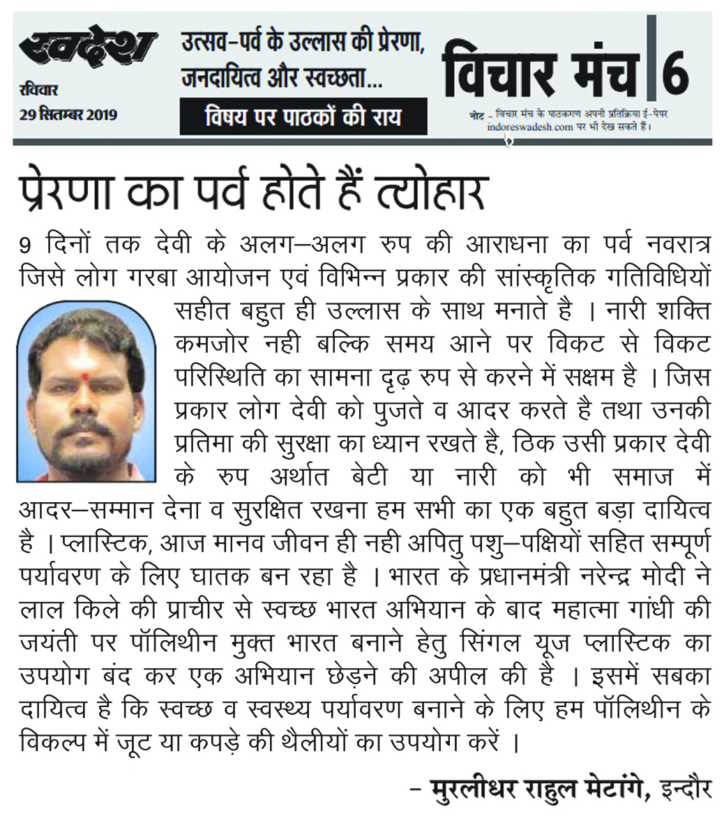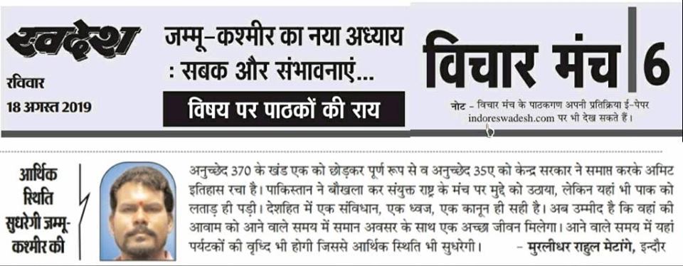 स्वदेश न्यूज़ पेपर में प्रति सप्ताह अलग-अलग विषयों पर सामाजिक कार्यकर्ता मुरलीधर राहुल मेटांगे द्वारा अपने विचार प्रकट किये गए । जो इस प्रकार है ।