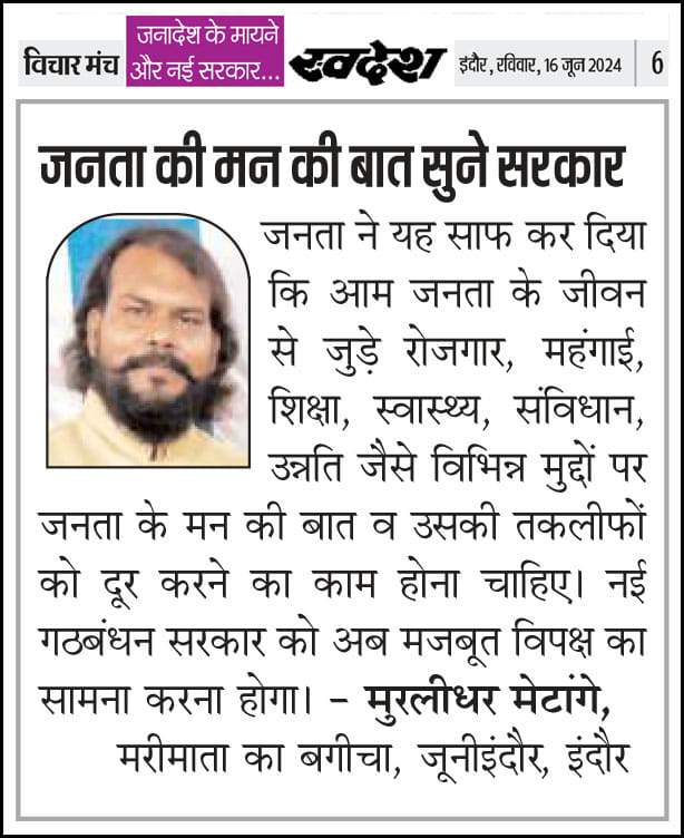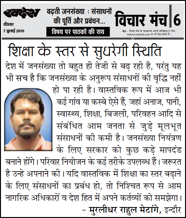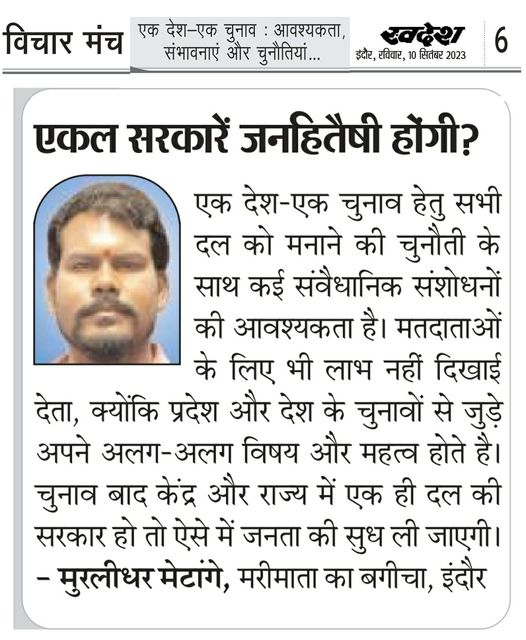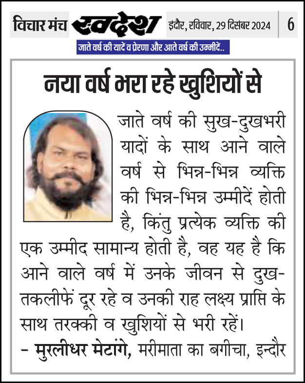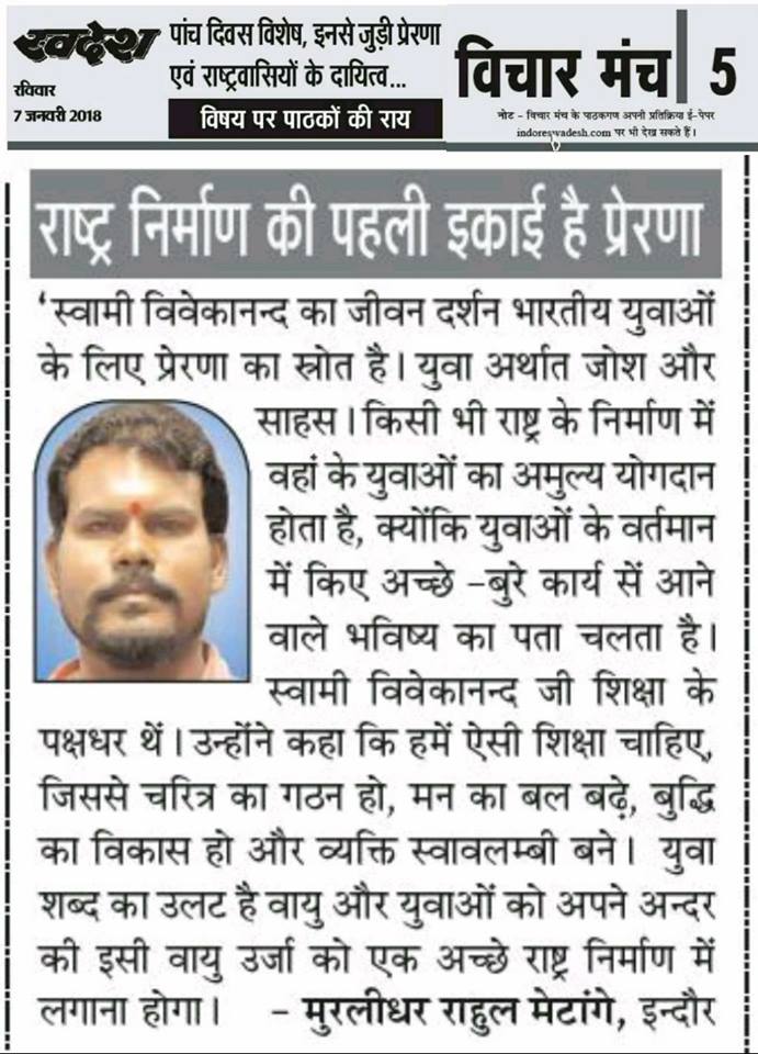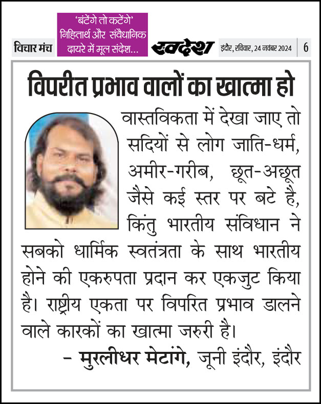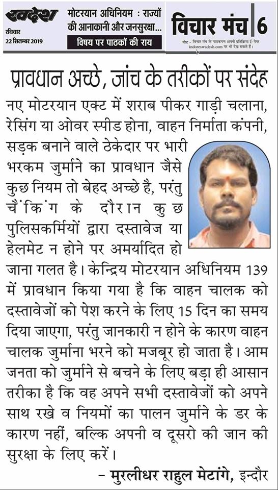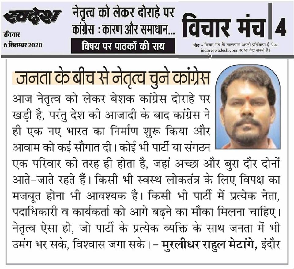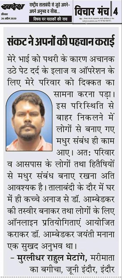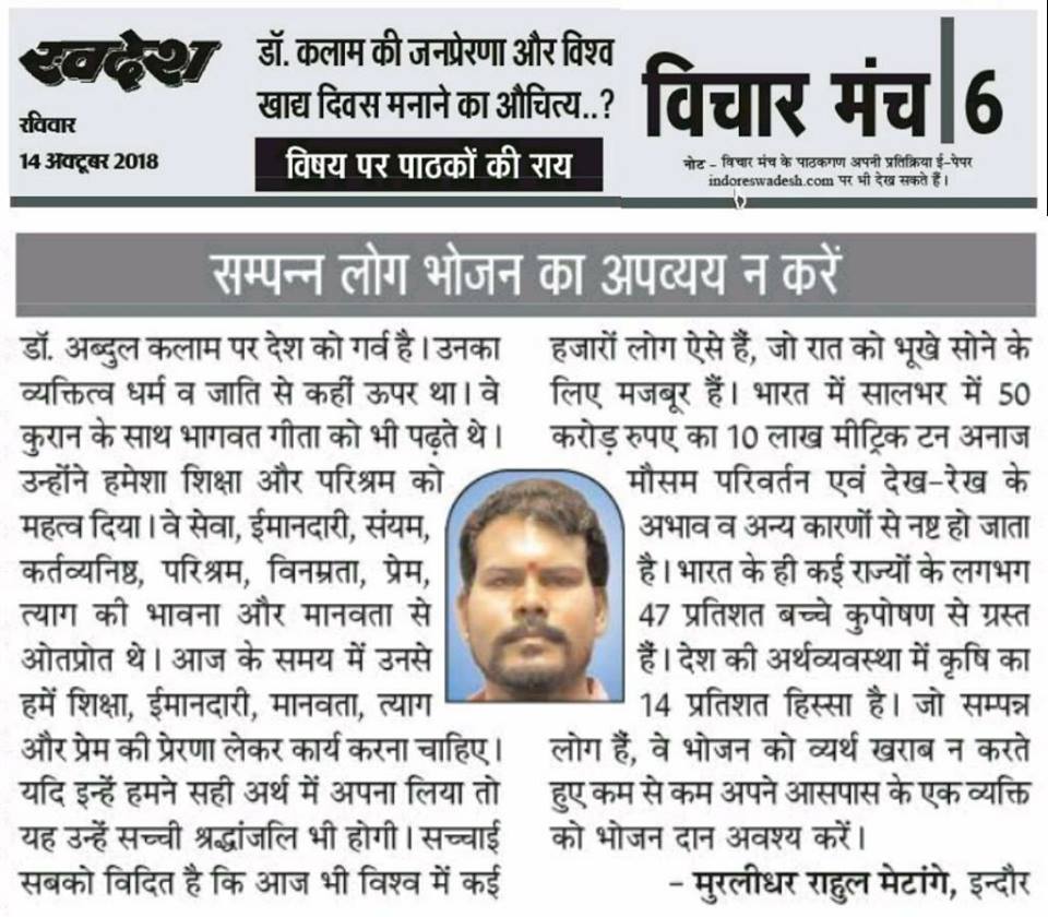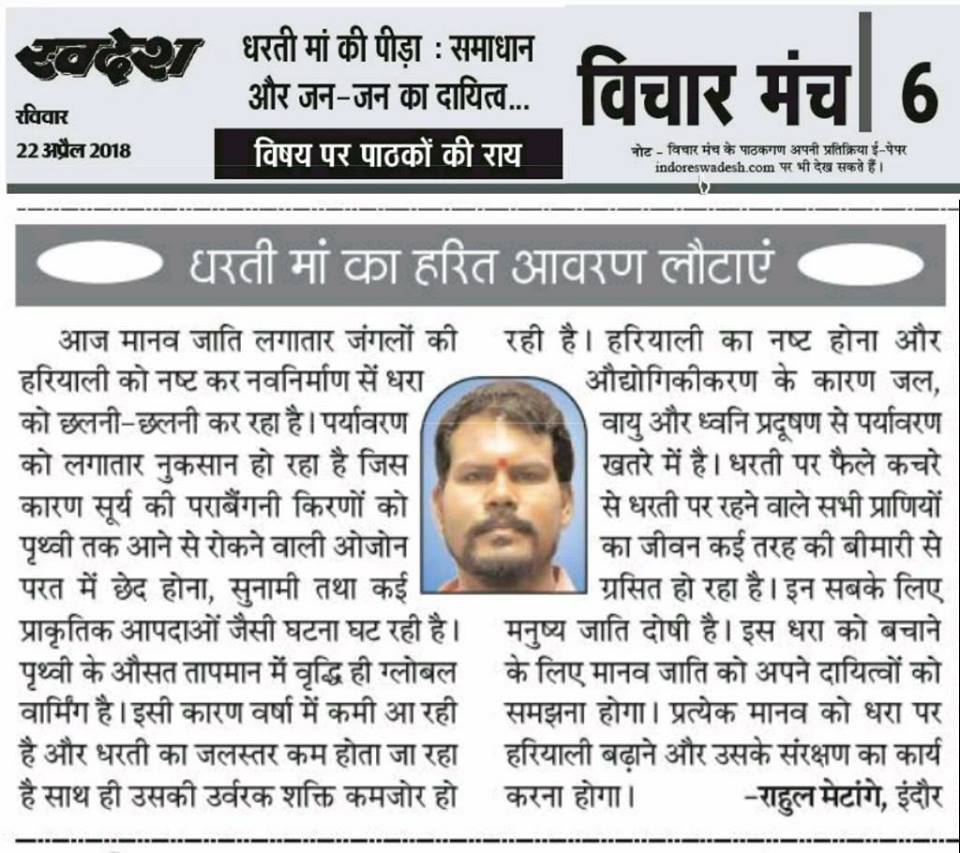 स्वदेश न्यूज़ पेपर में प्रति सप्ताह अलग-अलग विषयों पर सामाजिक कार्यकर्ता मुरलीधर राहुल मेटांगे द्वारा अपने विचार प्रकट किये गए । जो इस प्रकार है ।