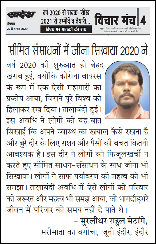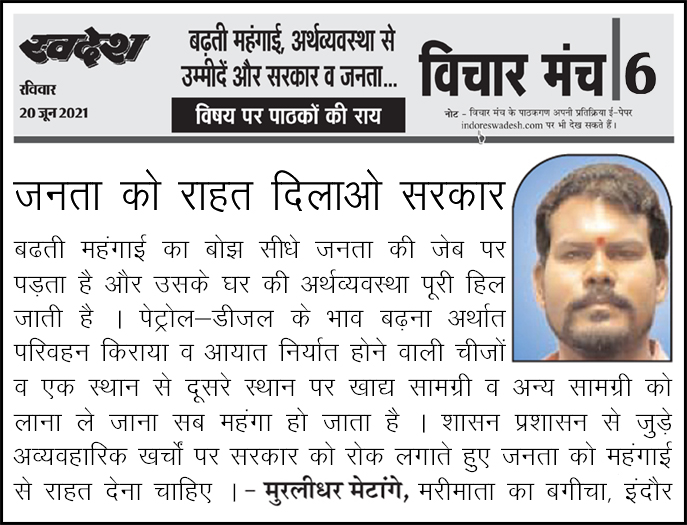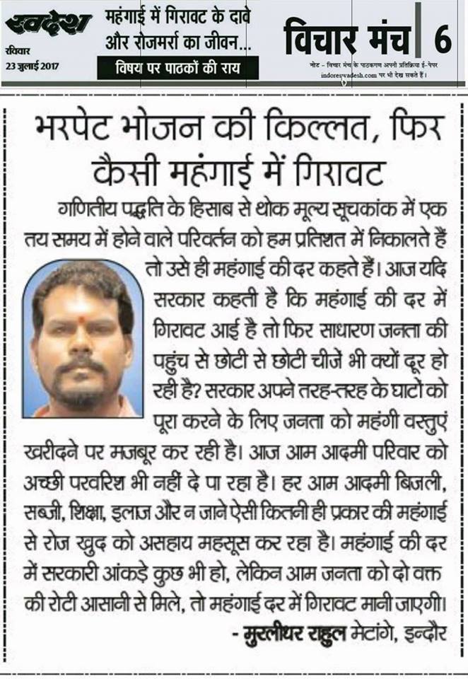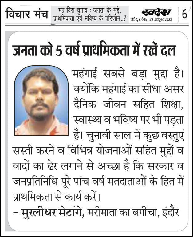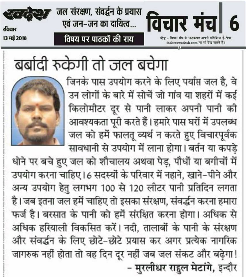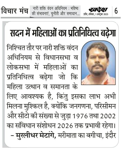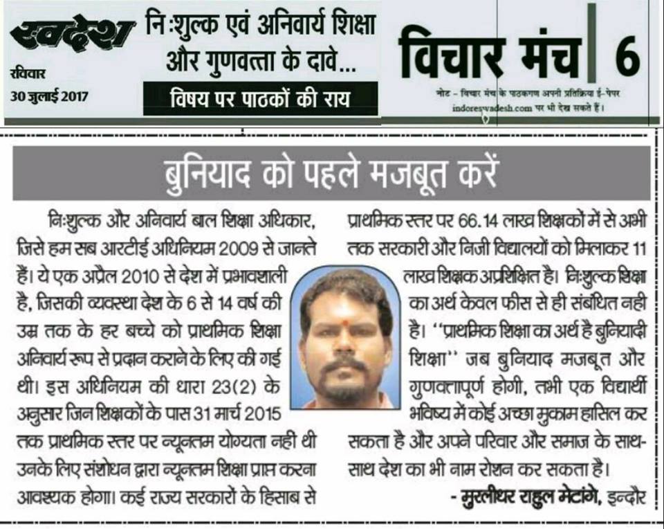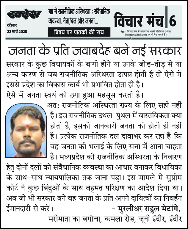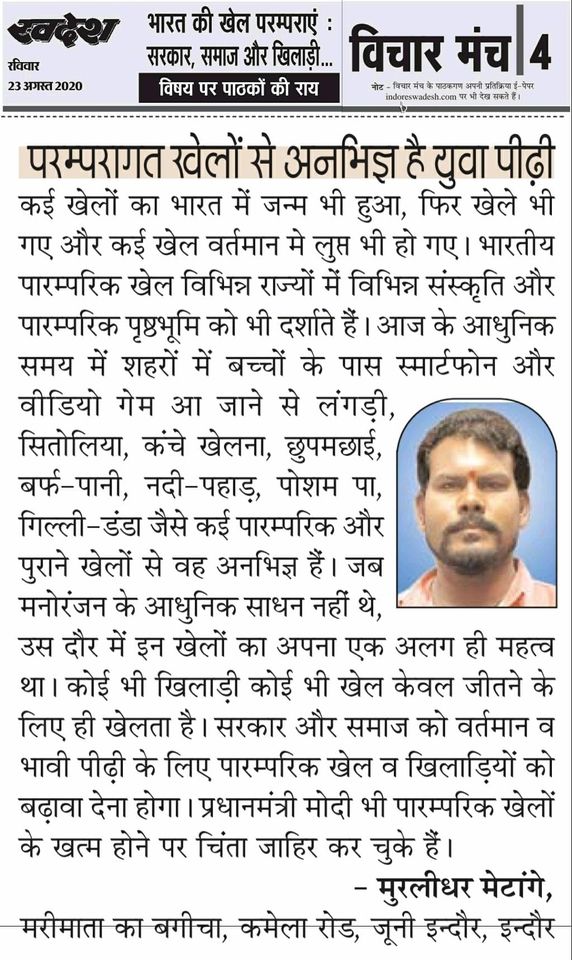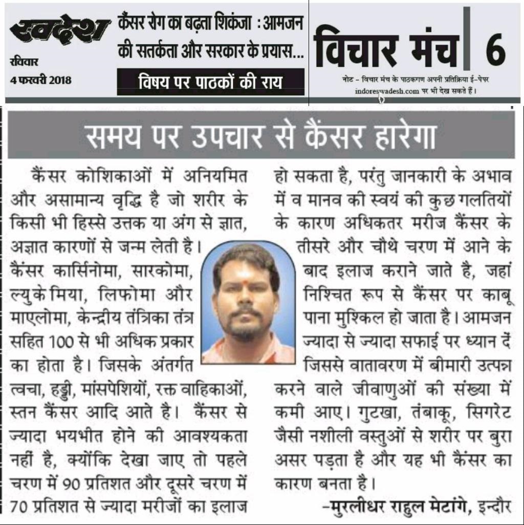 स्वदेश न्यूज़ पेपर में प्रति सप्ताह अलग-अलग विषयों पर सामाजिक कार्यकर्ता मुरलीधर राहुल मेटांगे द्वारा अपने विचार प्रकट किये गए । जो इस प्रकार है ।