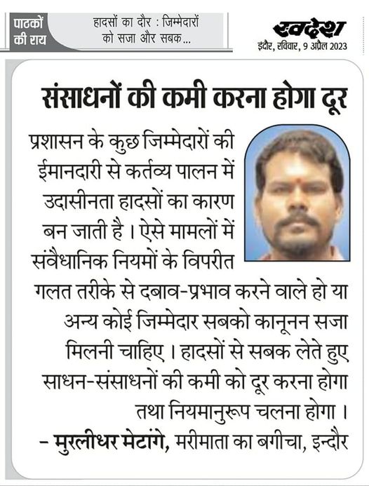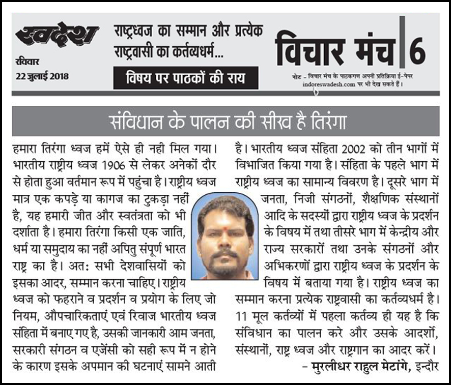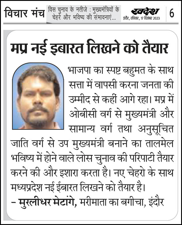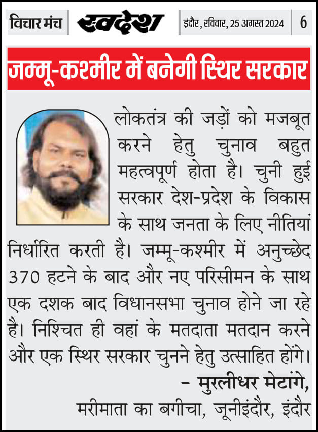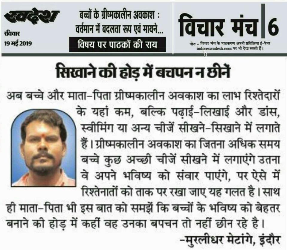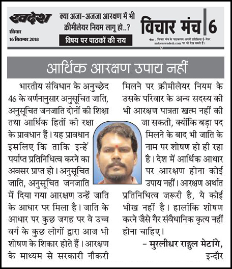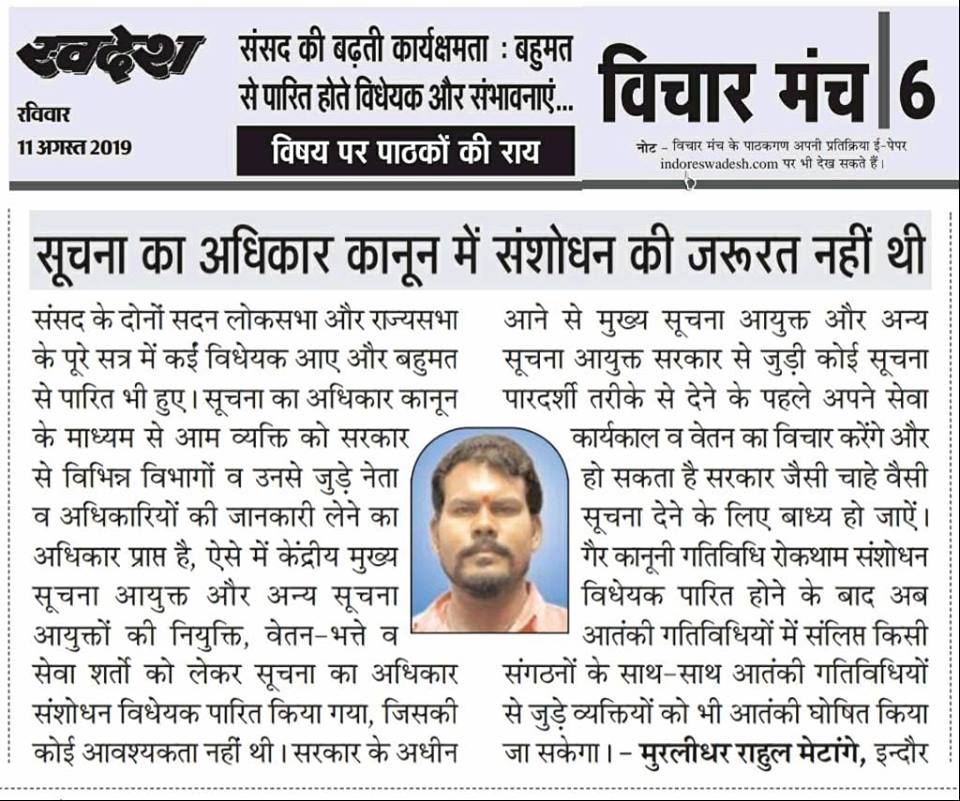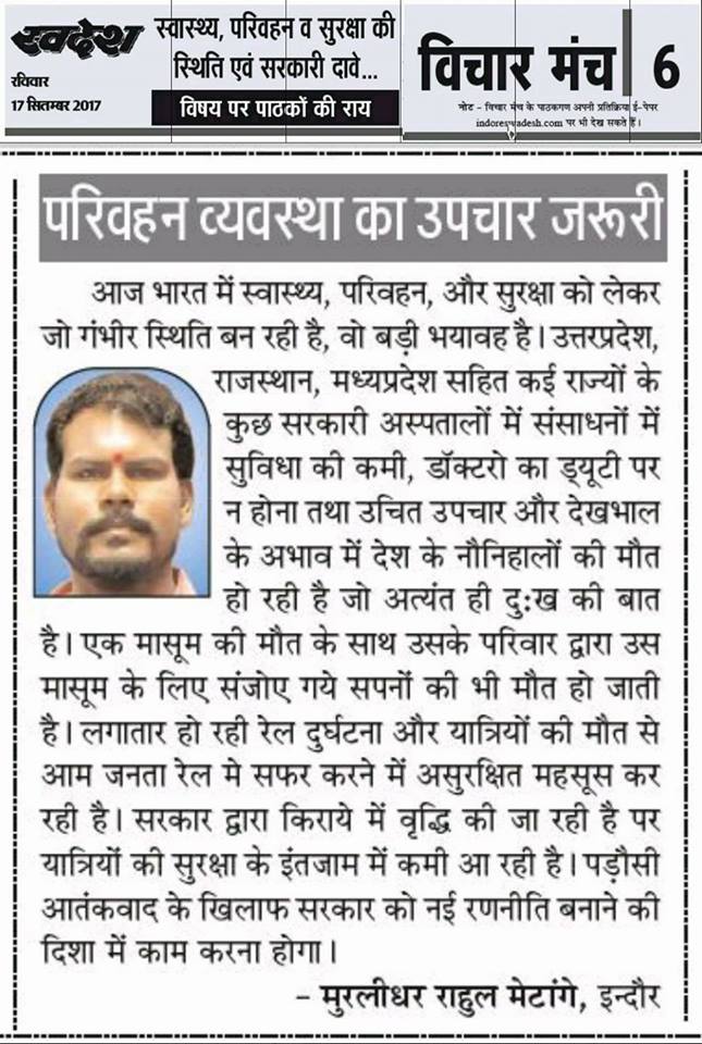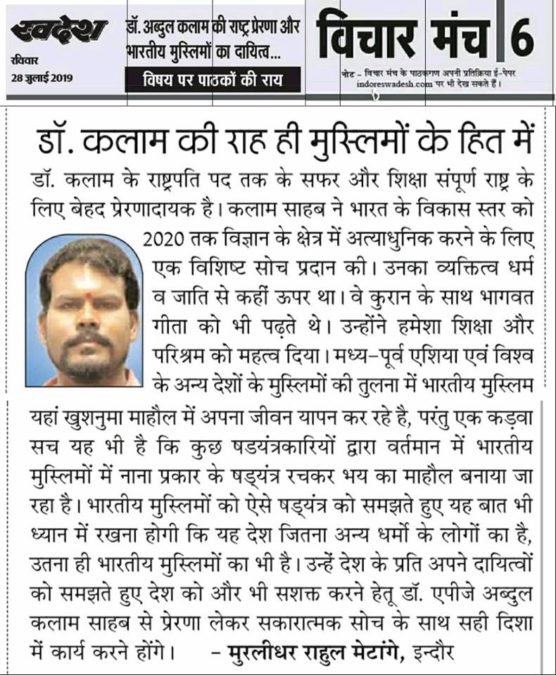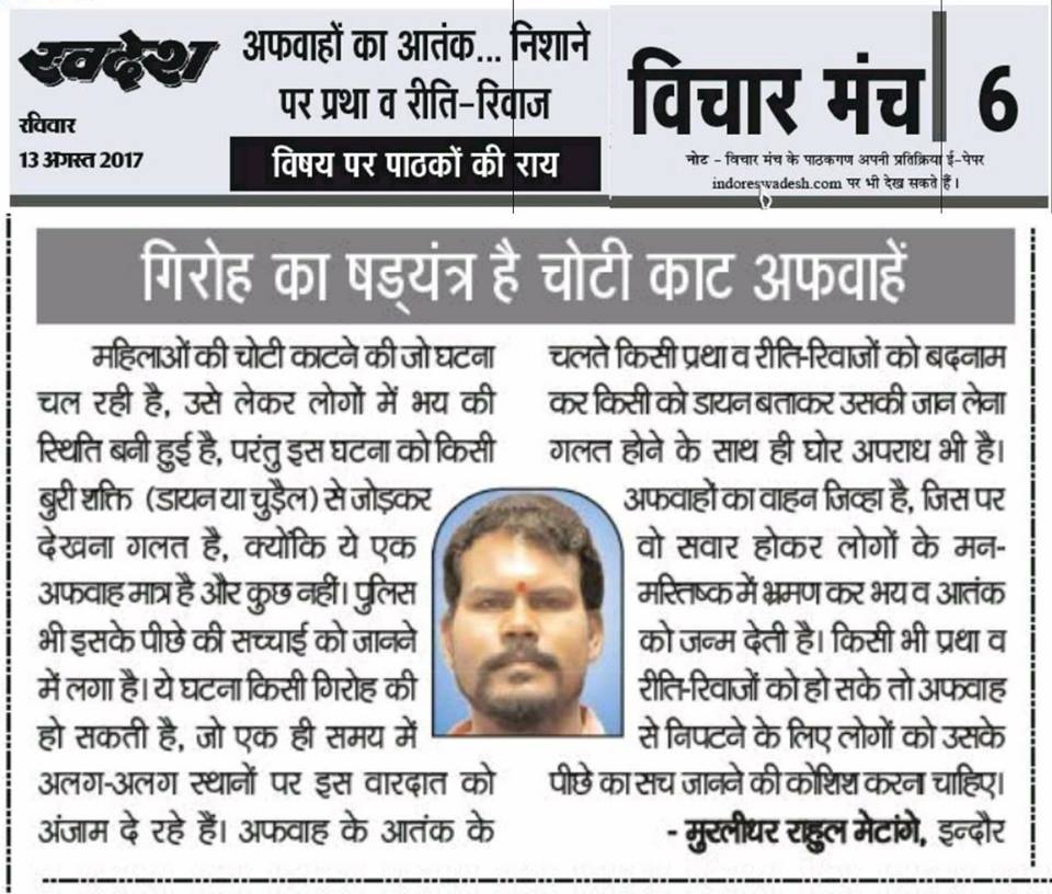 स्वदेश न्यूज़ पेपर में प्रति सप्ताह अलग-अलग विषयों पर सामाजिक कार्यकर्ता मुरलीधर राहुल मेटांगे द्वारा अपने विचार प्रकट किये गए । जो इस प्रकार है ।