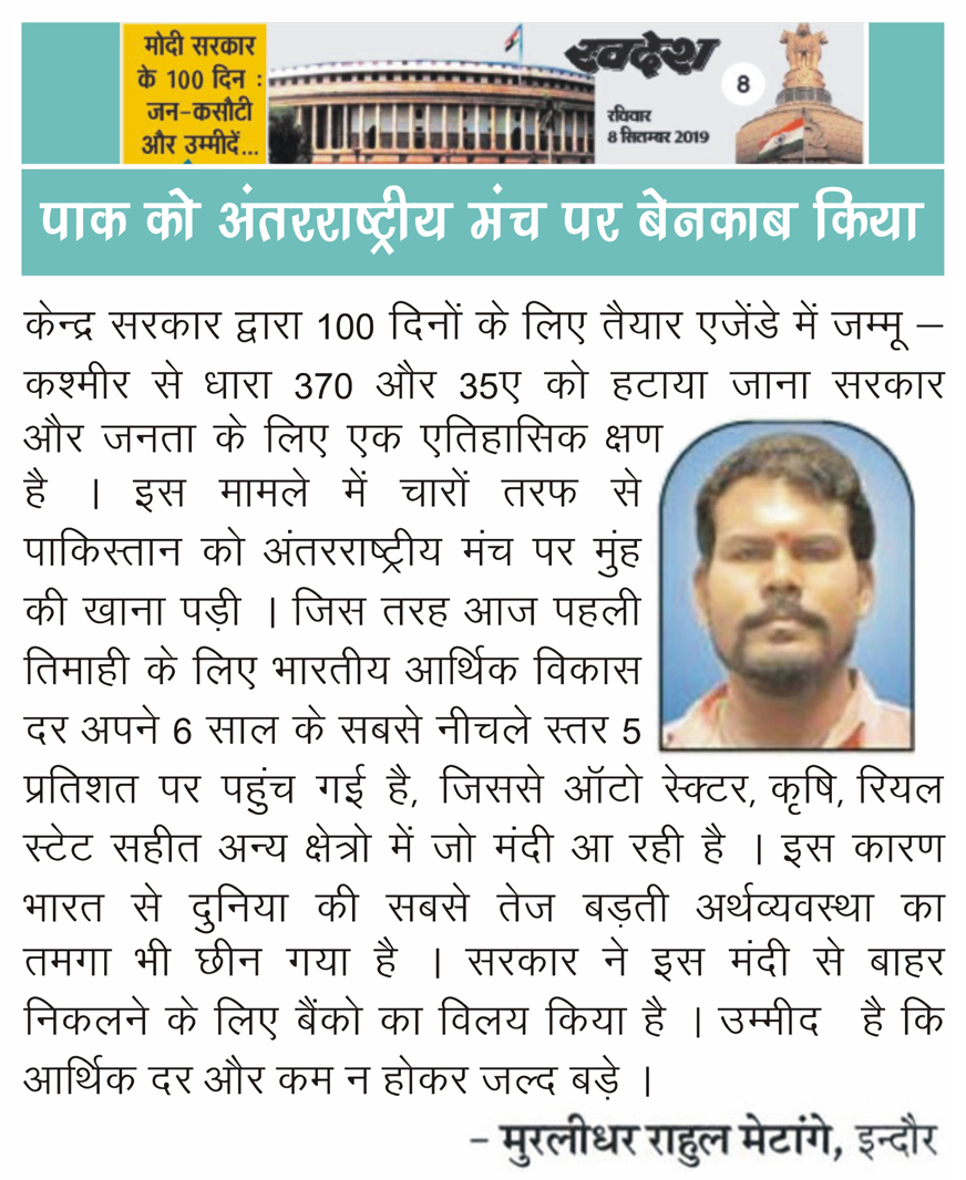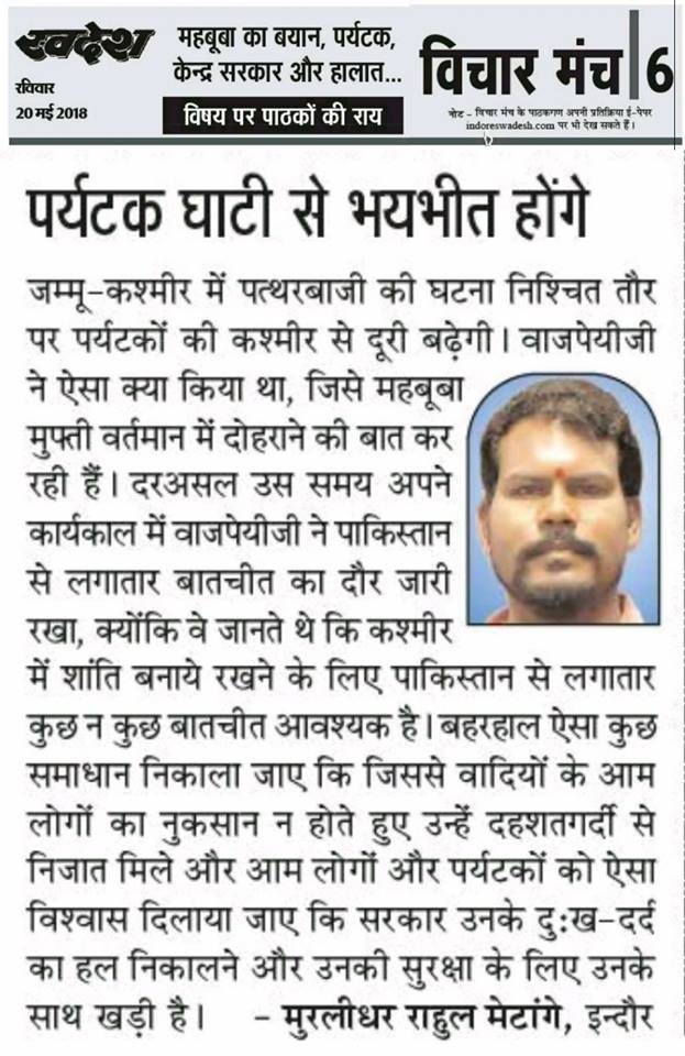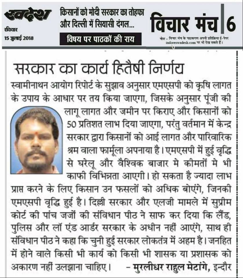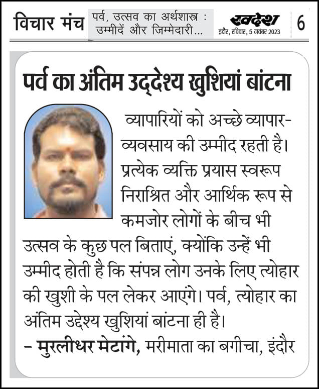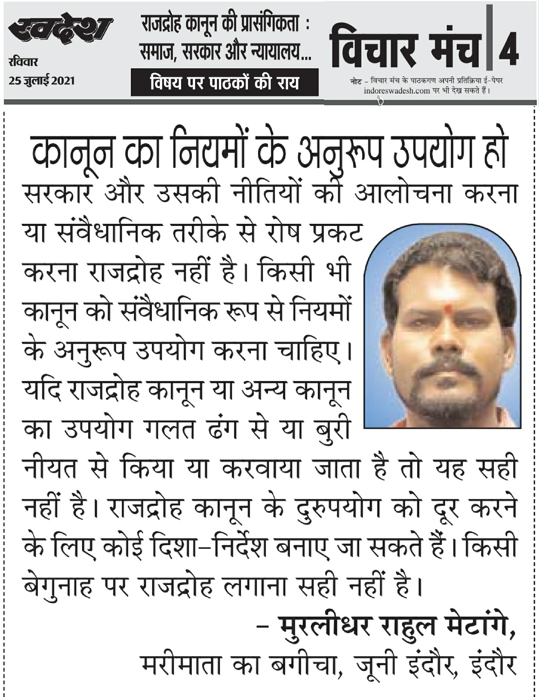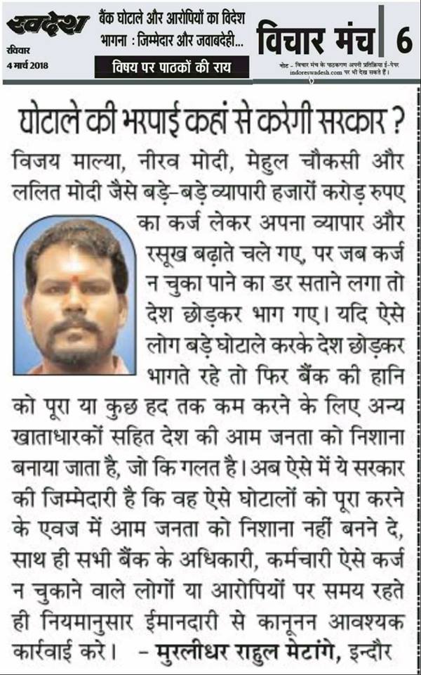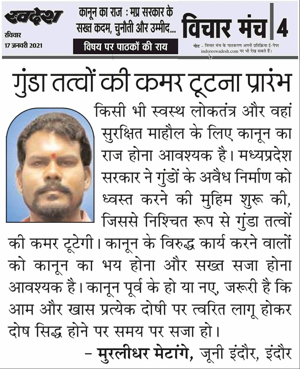 स्वदेश न्यूज़ पेपर में प्रति सप्ताह अलग-अलग विषयों पर सामाजिक कार्यकर्ता मुरलीधर राहुल मेटांगे द्वारा अपने विचार प्रकट किये गए । जो इस प्रकार है ।
