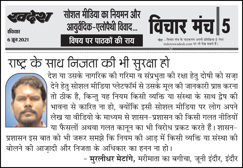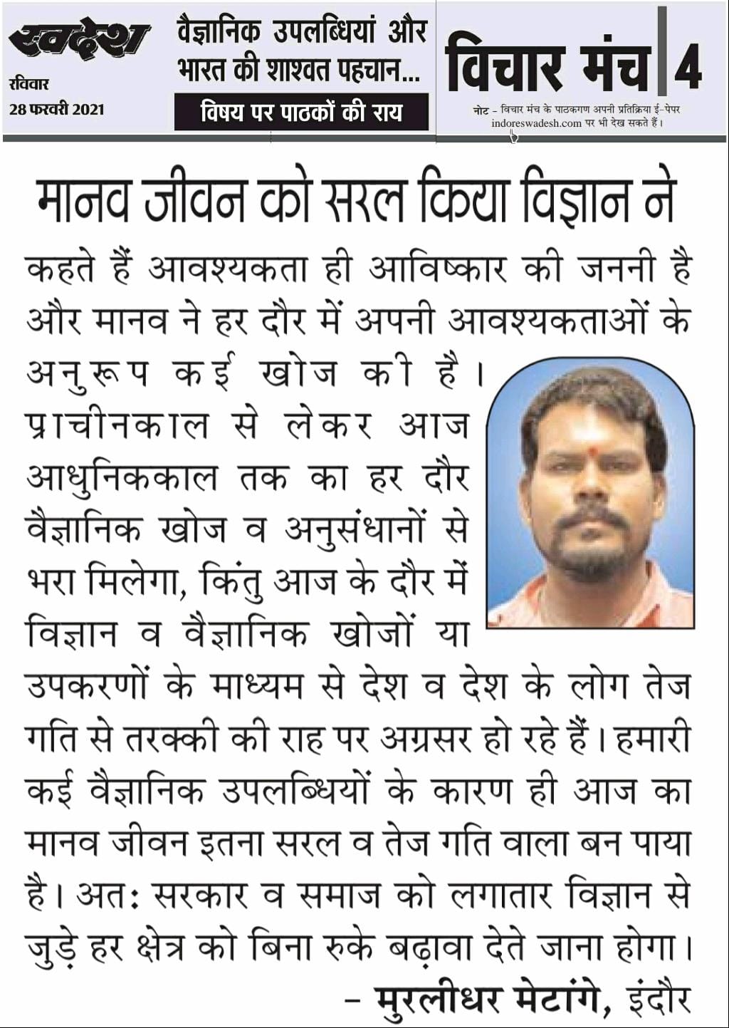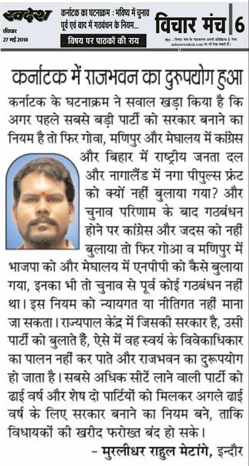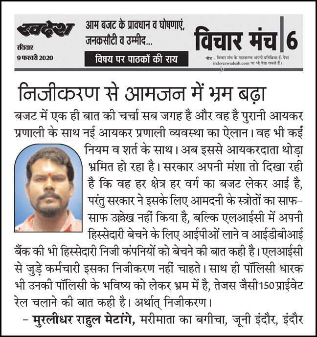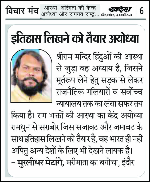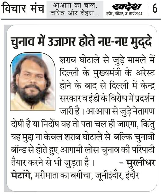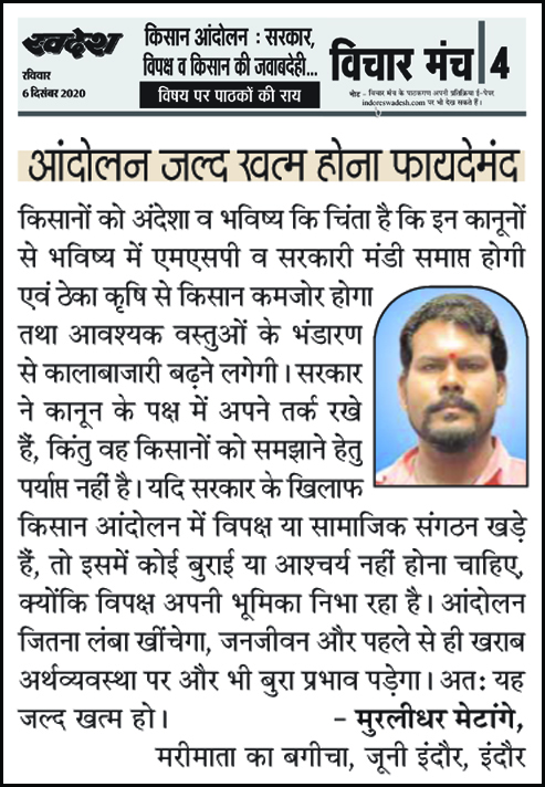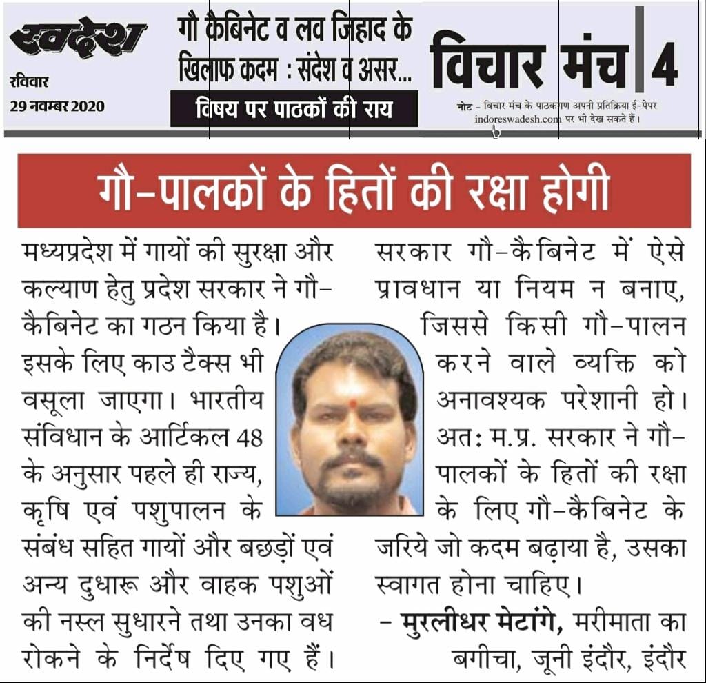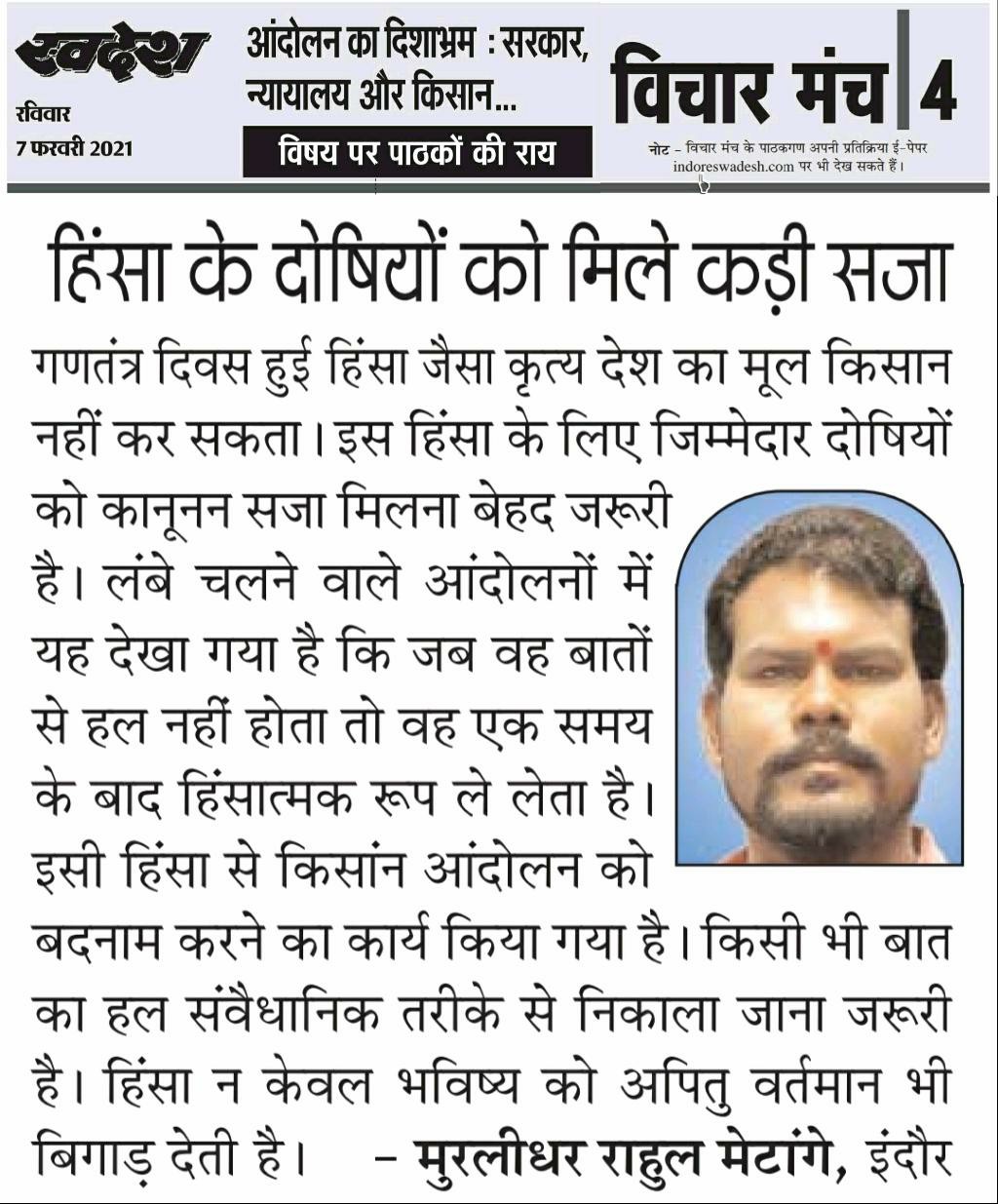स्वदेश न्यूज़ पेपर में प्रति सप्ताह अलग-अलग विषयों पर सामाजिक कार्यकर्ता मुरलीधर राहुल मेटांगे द्वारा अपने विचार प्रकट किये गए । जो इस प्रकार है ।