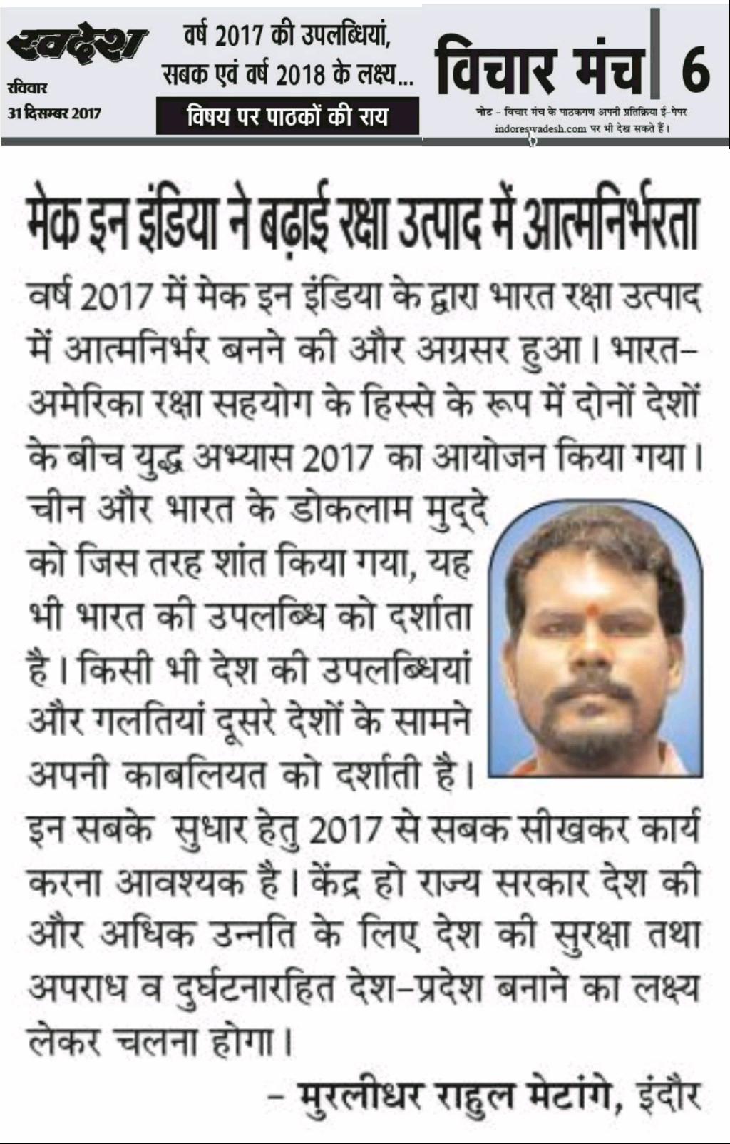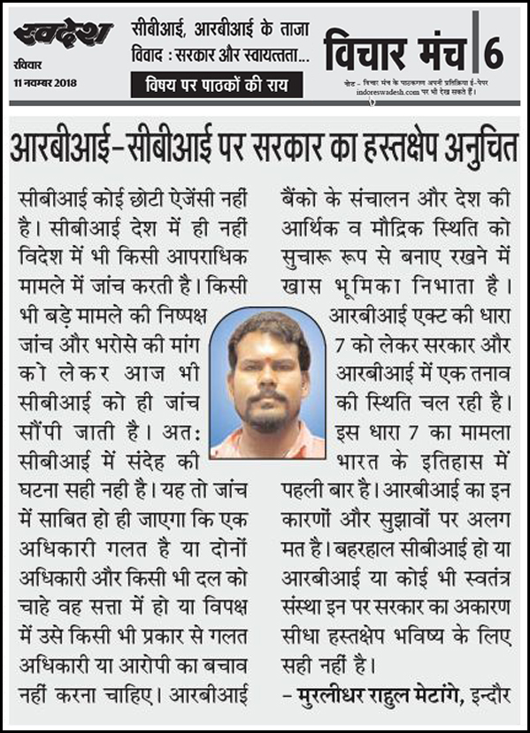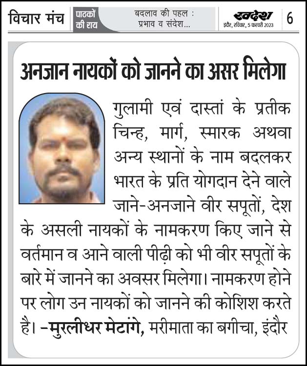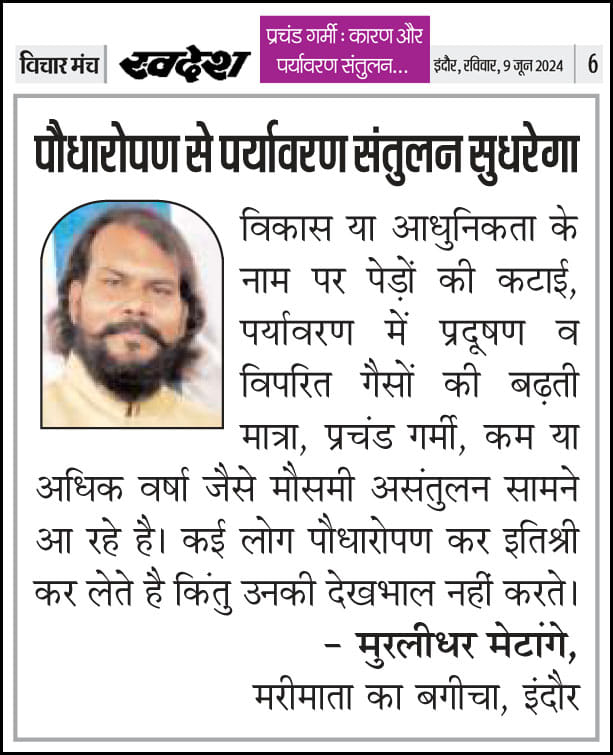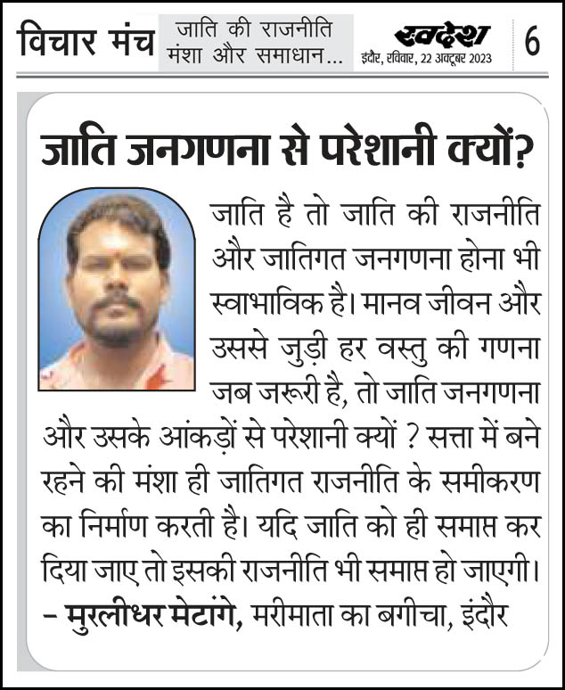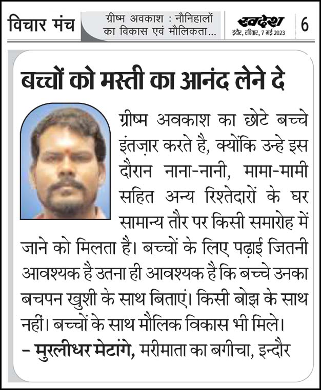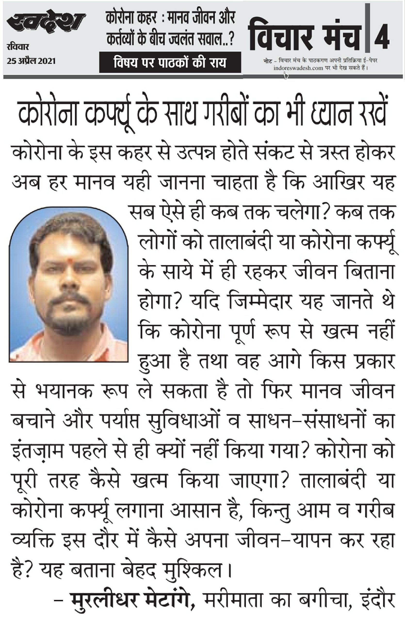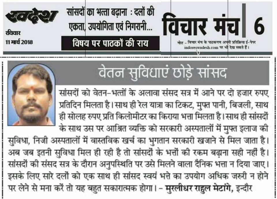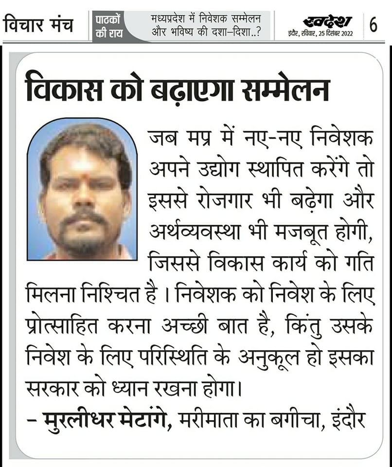 स्वदेश न्यूज़ पेपर में प्रति सप्ताह अलग-अलग विषयों पर सामाजिक कार्यकर्ता मुरलीधर राहुल मेटांगे द्वारा अपने विचार प्रकट किये गए । जो इस प्रकार है ।