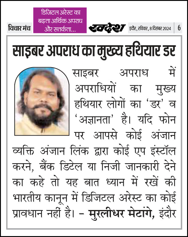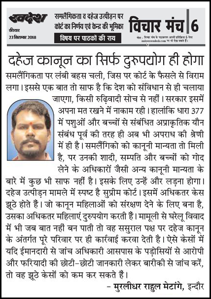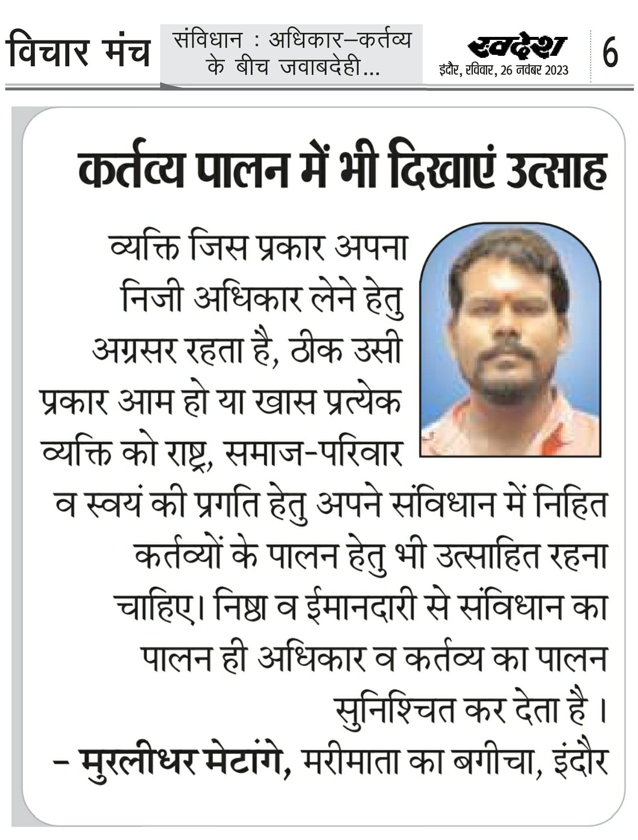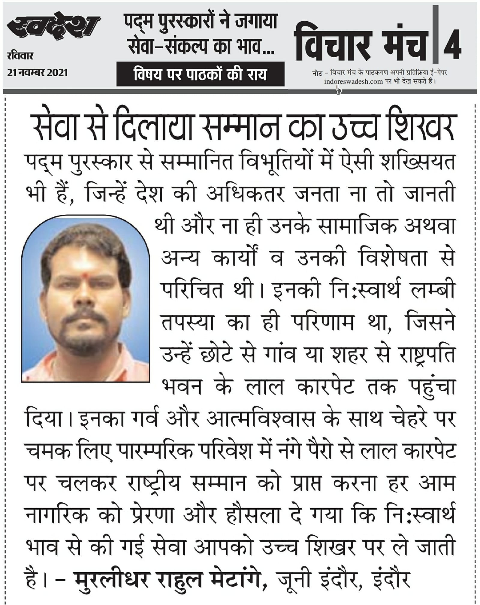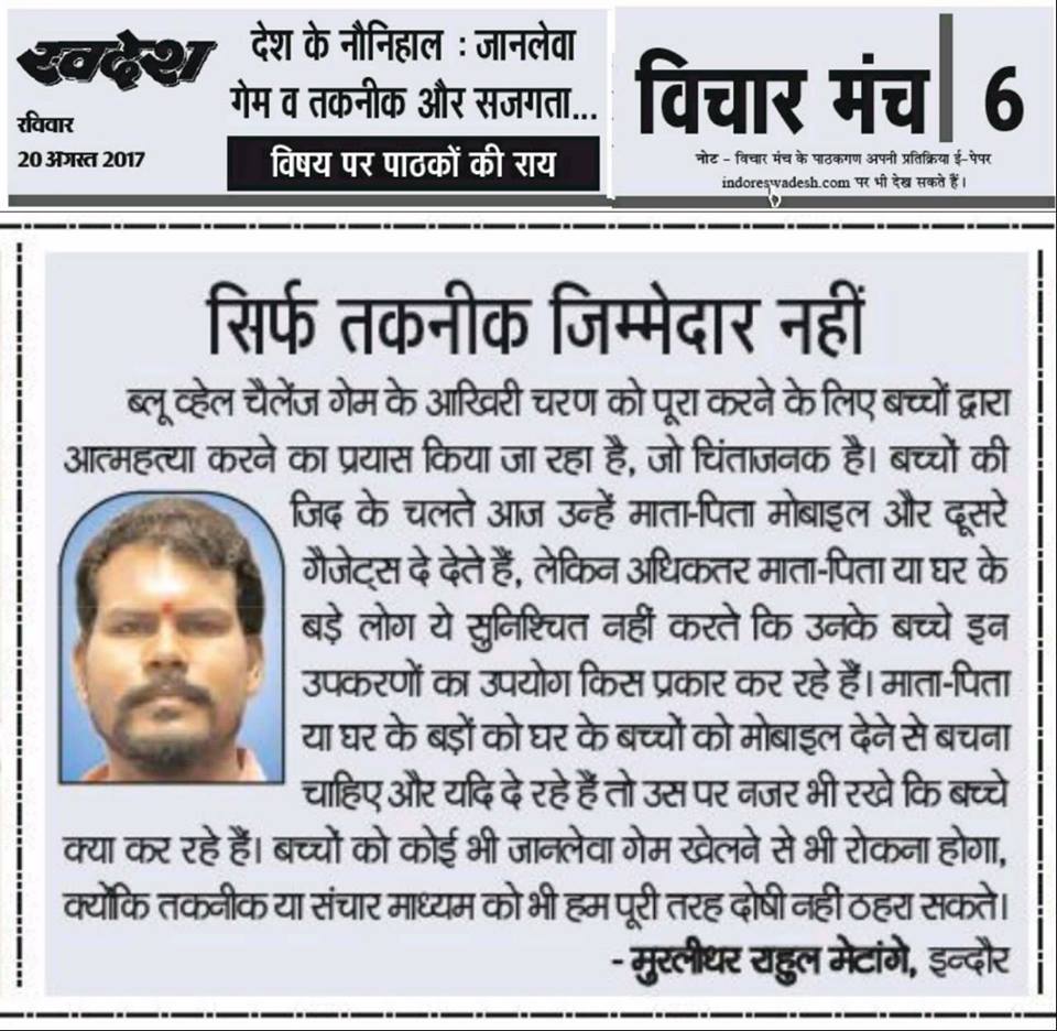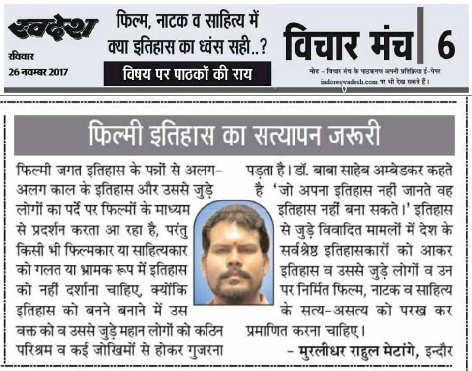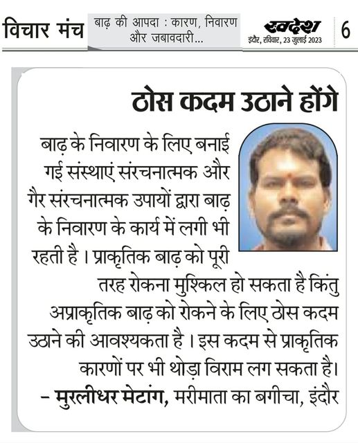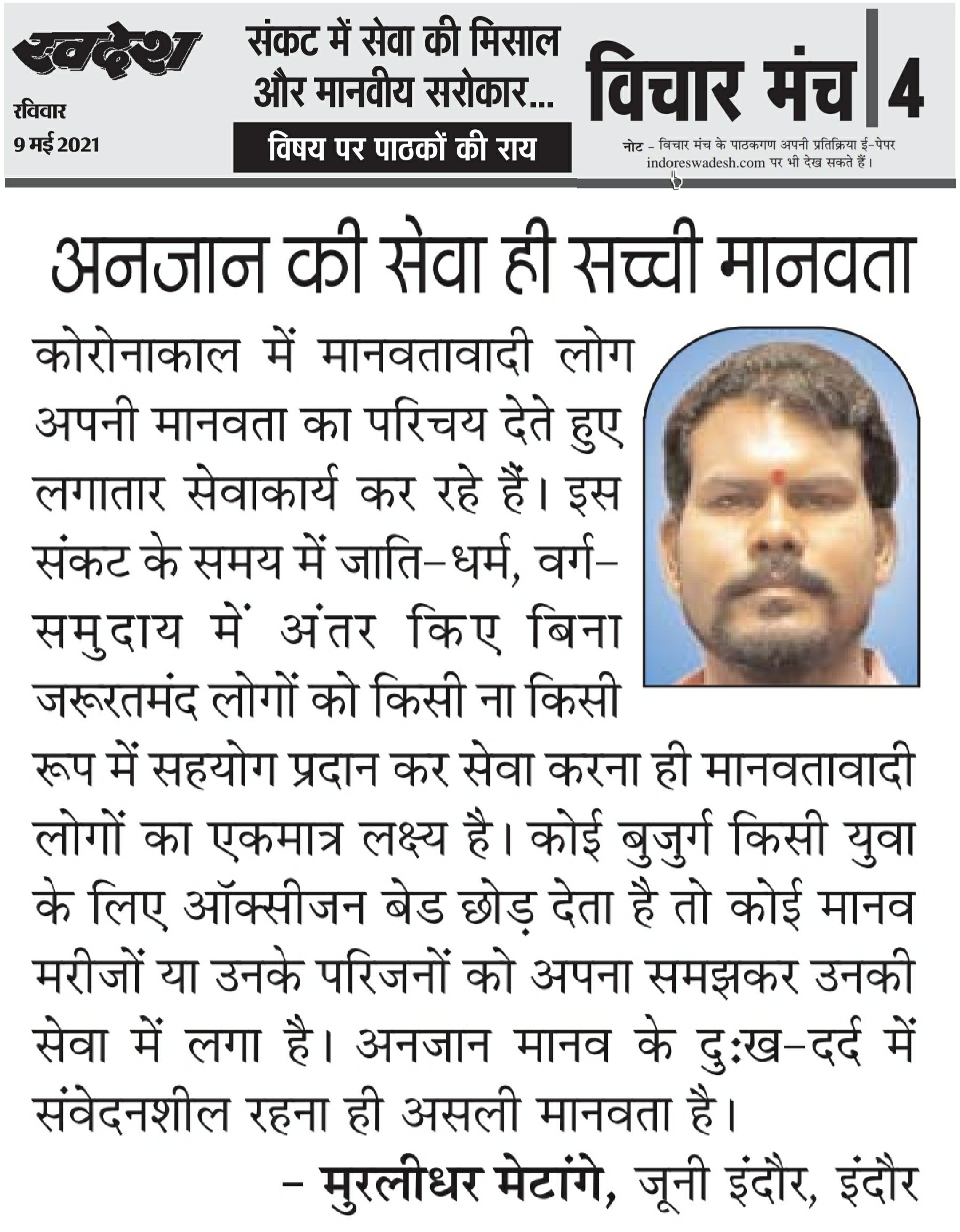 स्वदेश न्यूज़ पेपर में प्रति सप्ताह अलग-अलग विषयों पर सामाजिक कार्यकर्ता मुरलीधर राहुल मेटांगे द्वारा अपने विचार प्रकट किये गए । जो इस प्रकार है ।