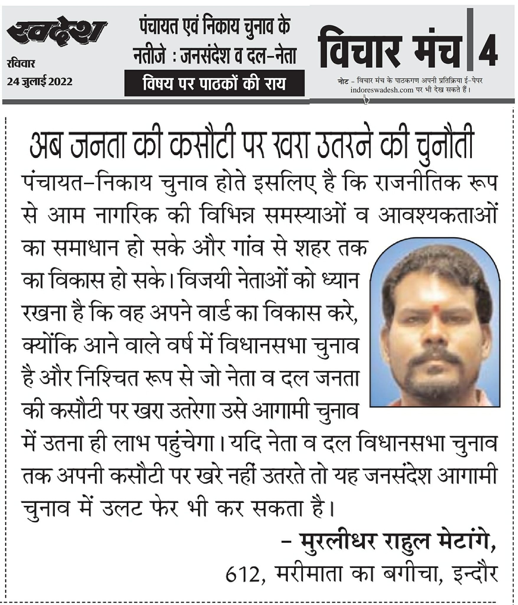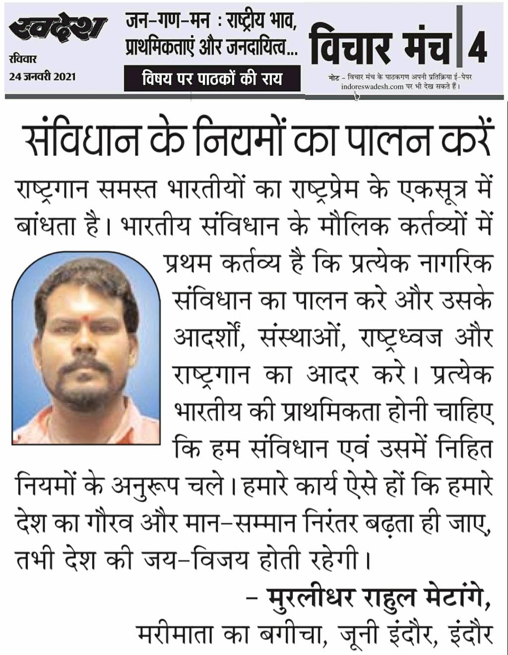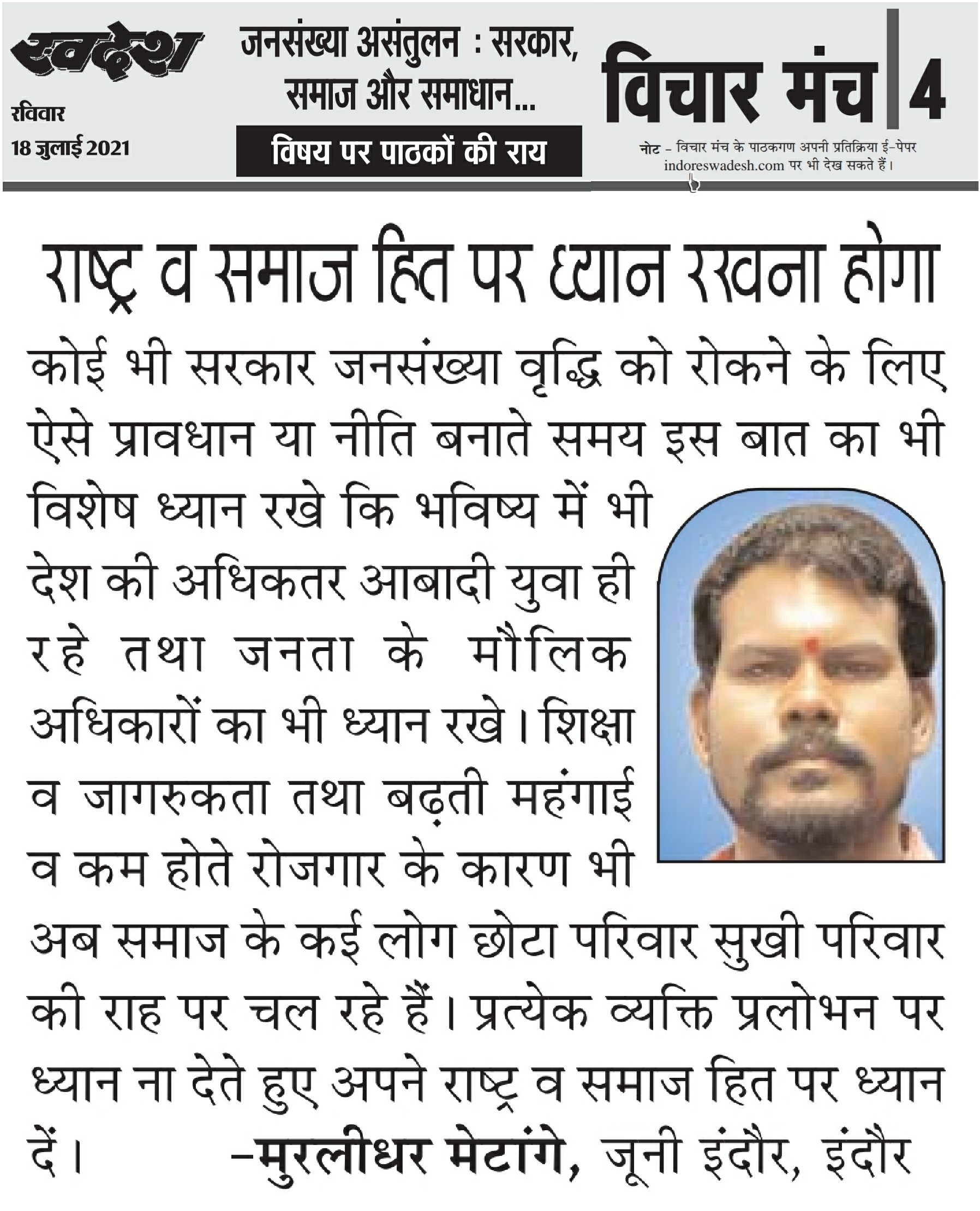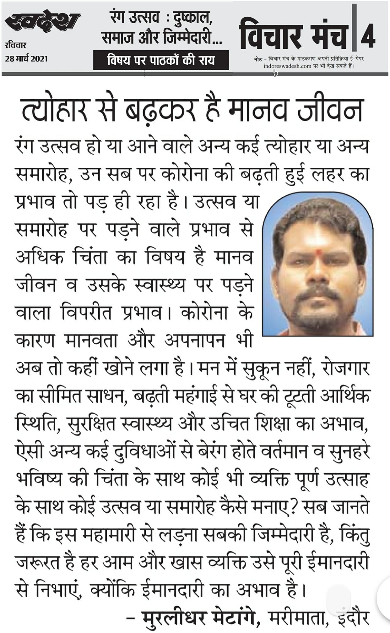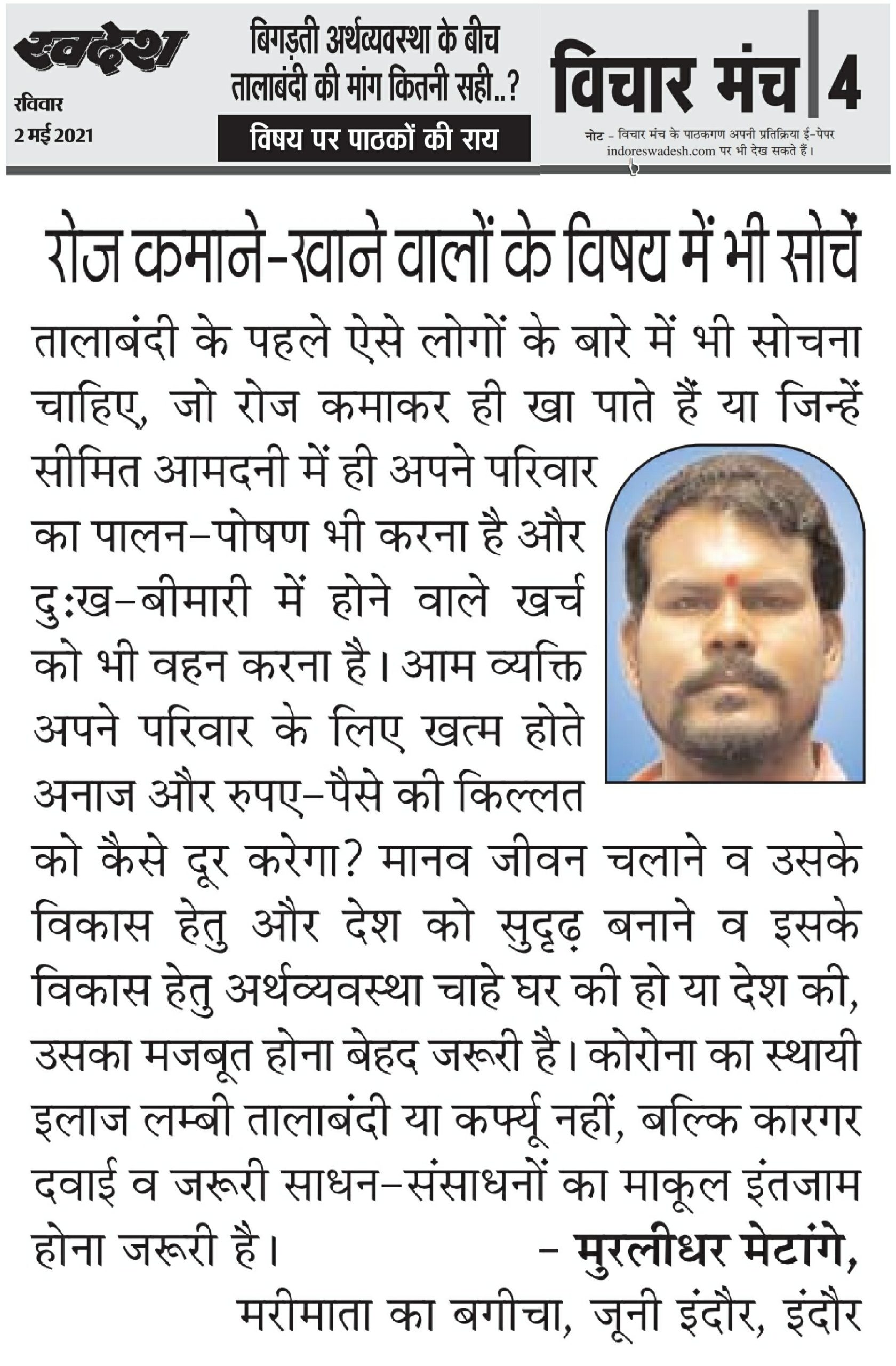 स्वदेश न्यूज़ पेपर में प्रति सप्ताह अलग-अलग विषयों पर सामाजिक कार्यकर्ता मुरलीधर राहुल मेटांगे द्वारा अपने विचार प्रकट किये गए । जो इस प्रकार है ।