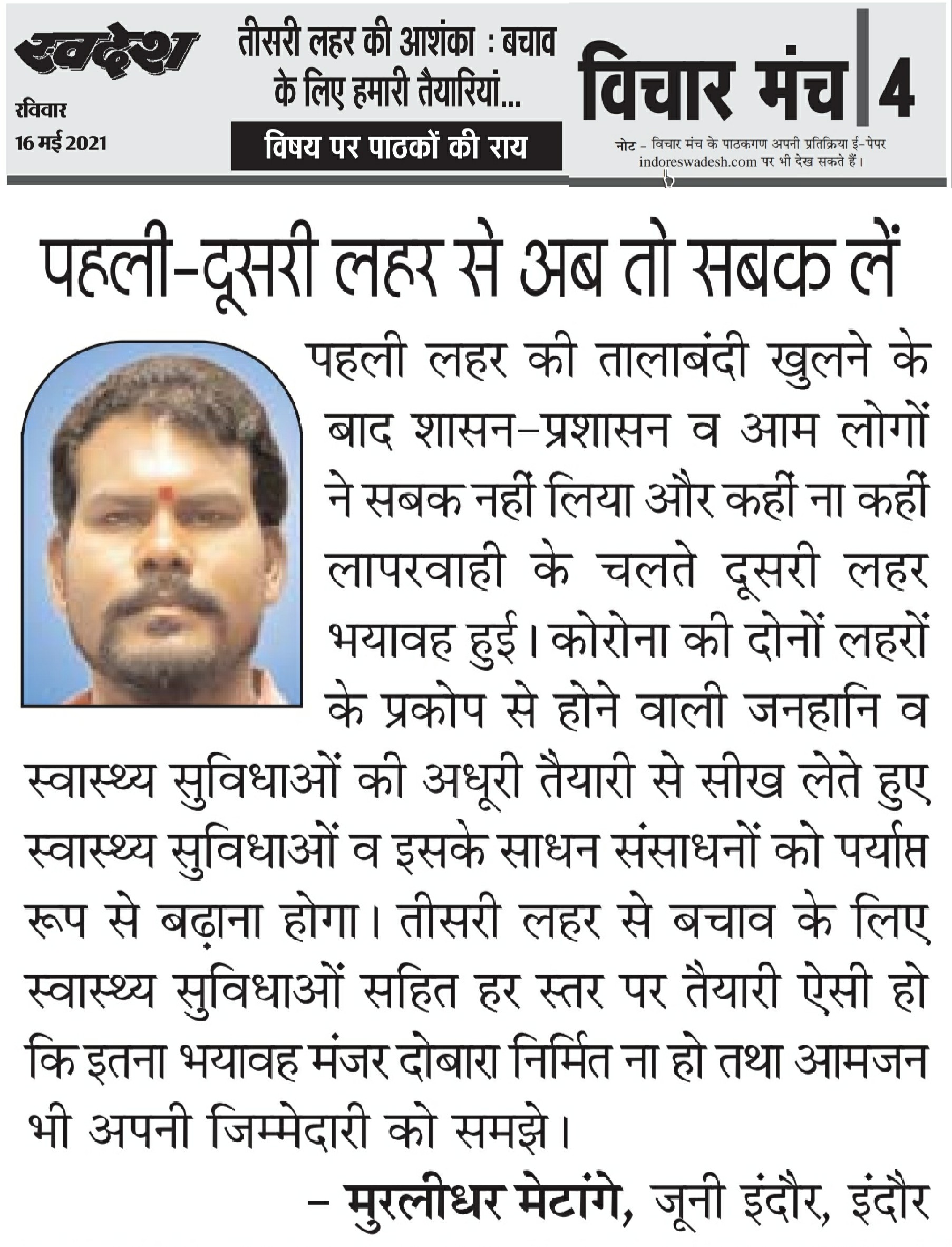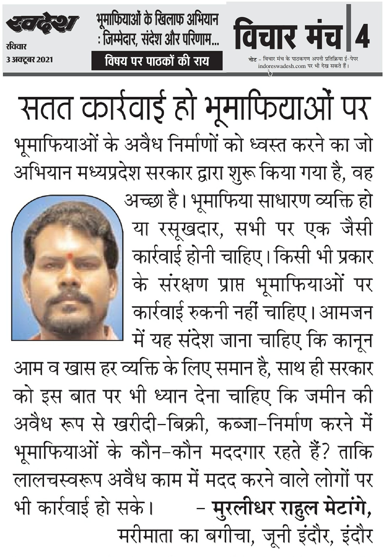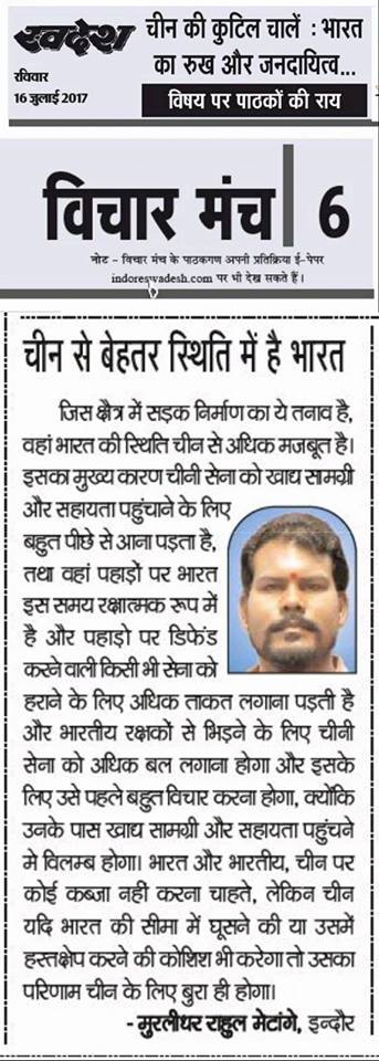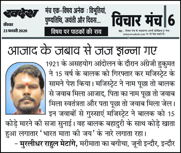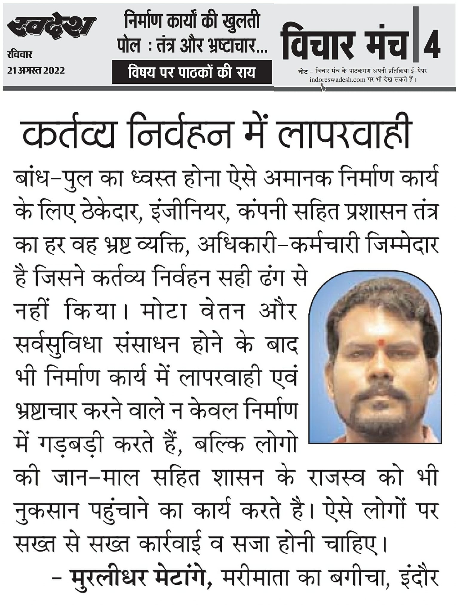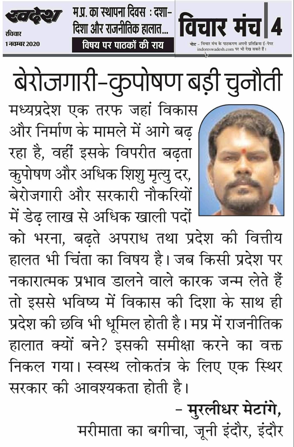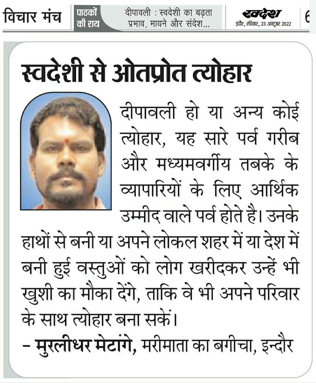 स्वदेश न्यूज़ पेपर में प्रति सप्ताह अलग-अलग विषयों पर सामाजिक कार्यकर्ता मुरलीधर राहुल मेटांगे द्वारा अपने विचार प्रकट किये गए । जो इस प्रकार है ।