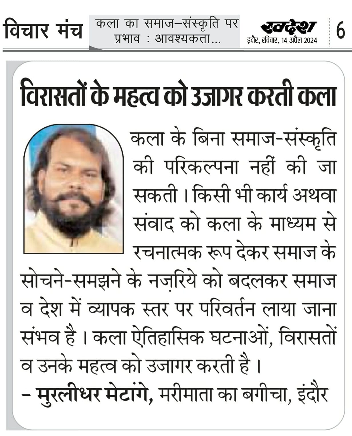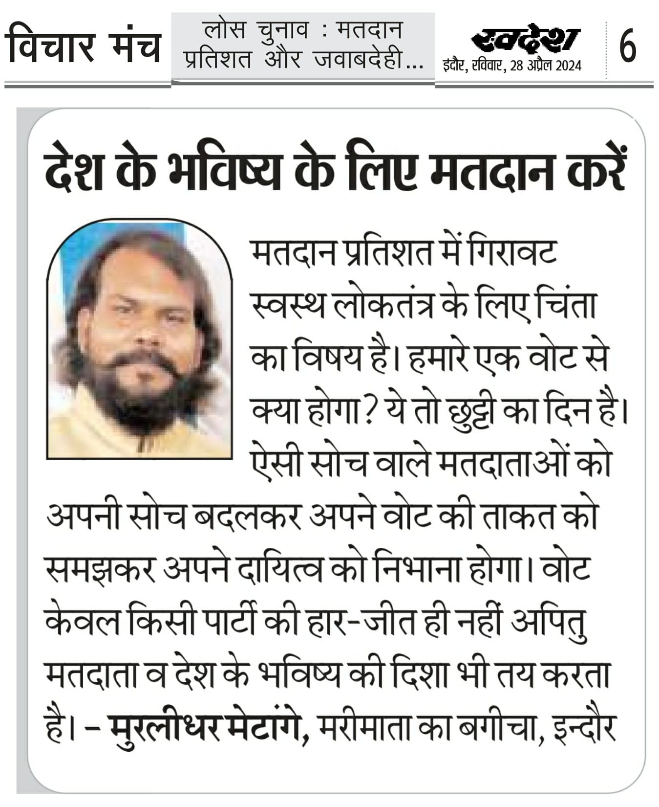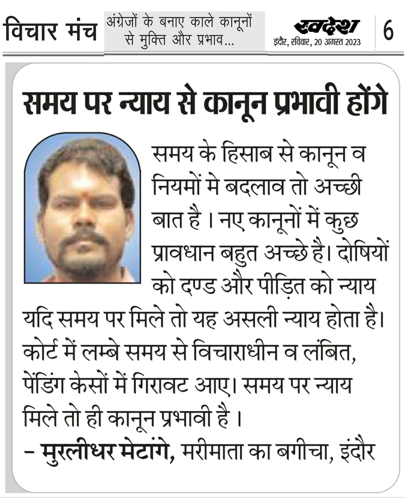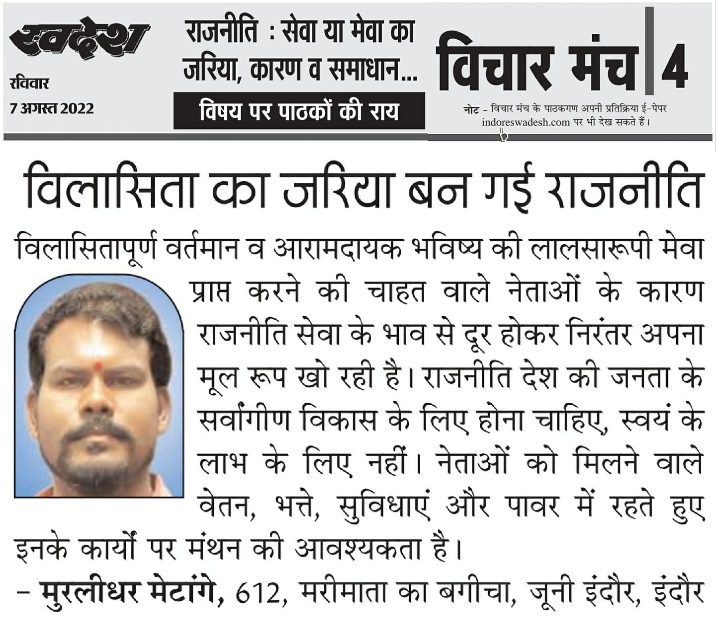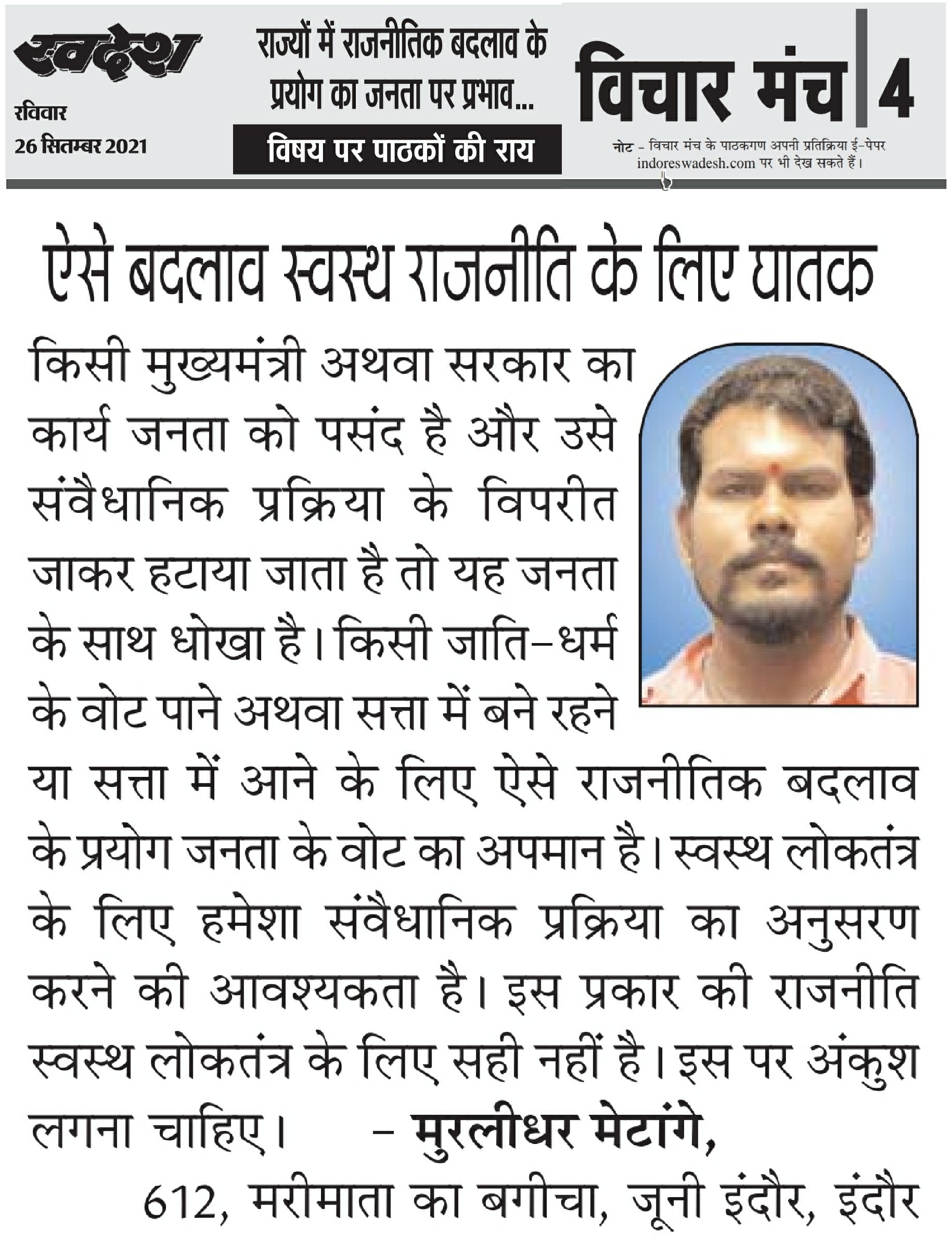 स्वदेश न्यूज़ पेपर में प्रति सप्ताह अलग-अलग विषयों पर सामाजिक कार्यकर्ता मुरलीधर राहुल मेटांगे द्वारा अपने विचार प्रकट किये गए । जो इस प्रकार है ।