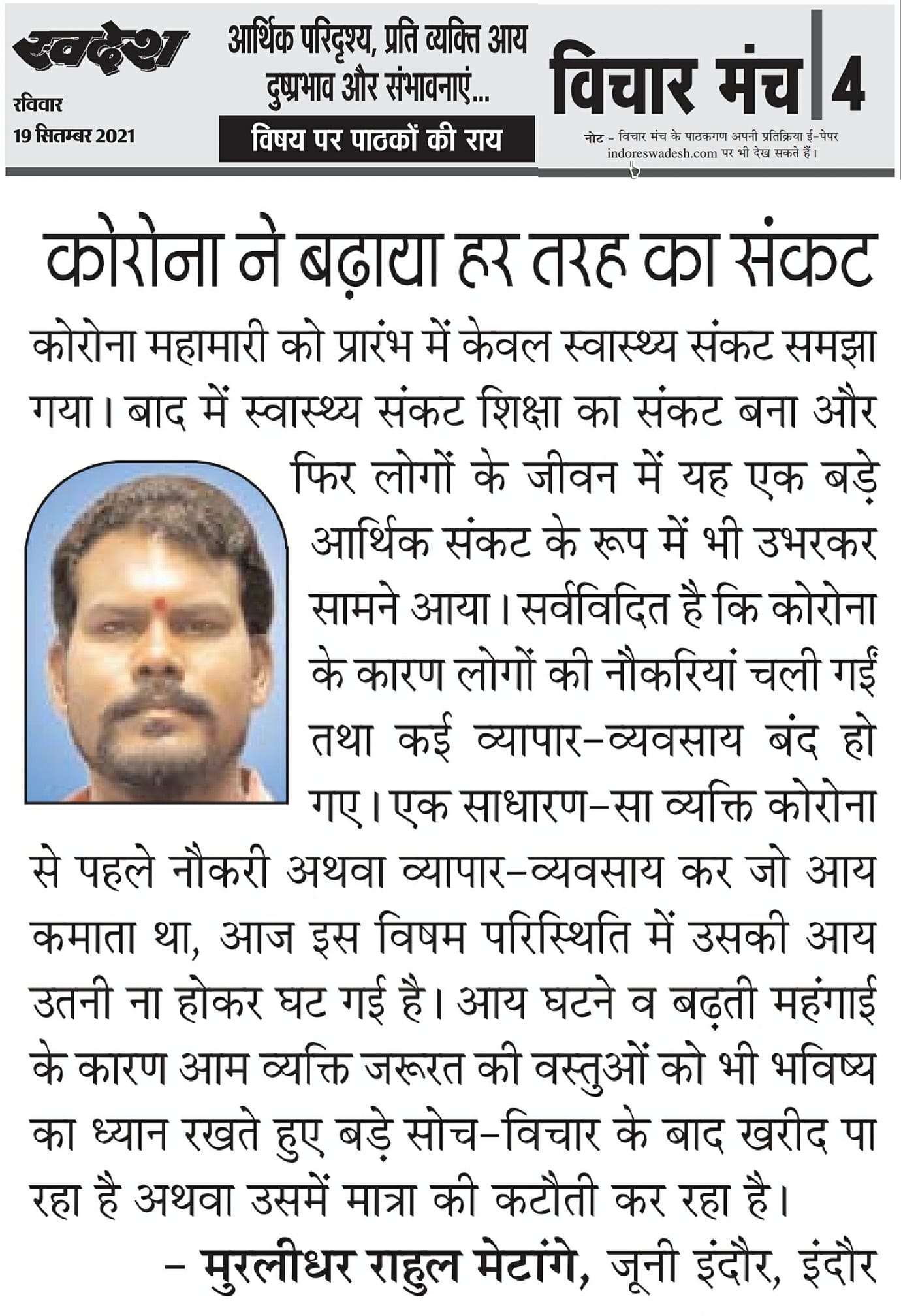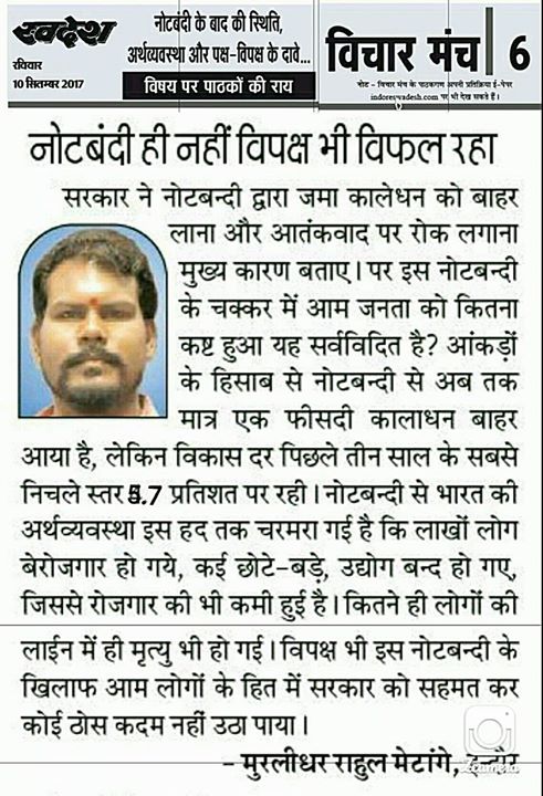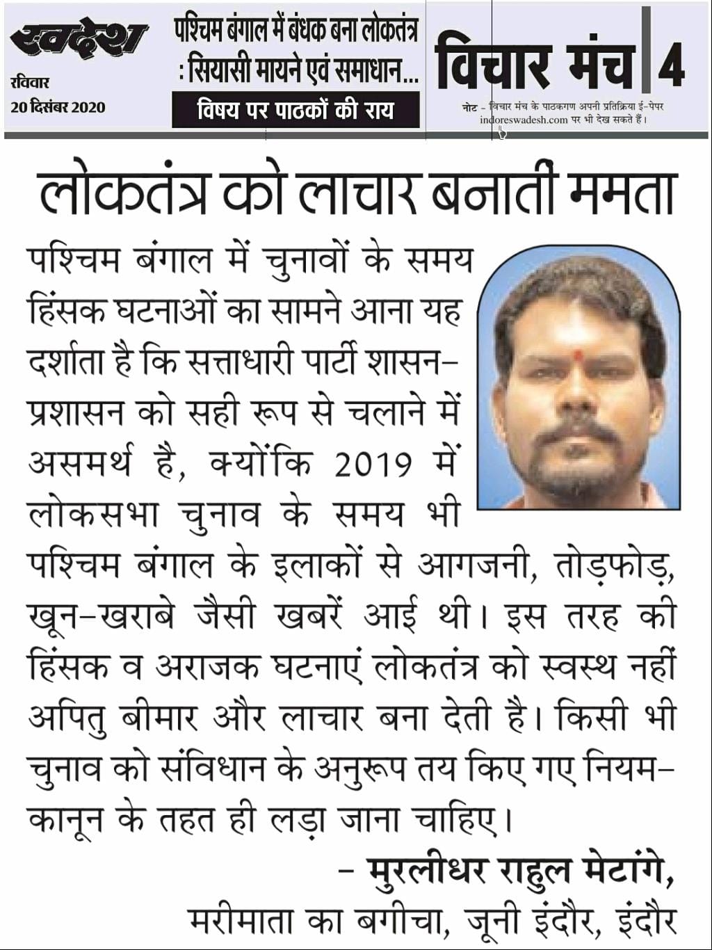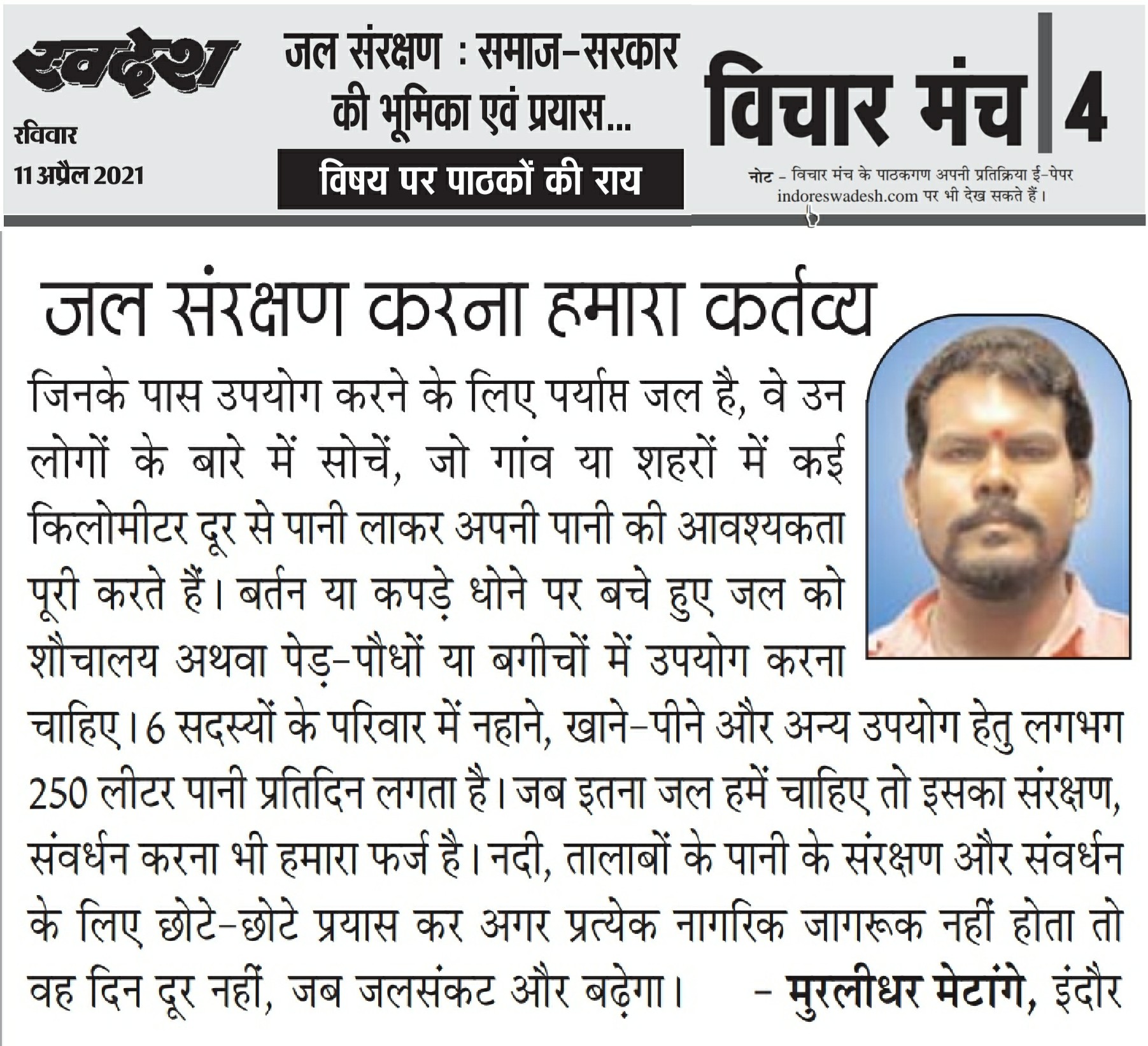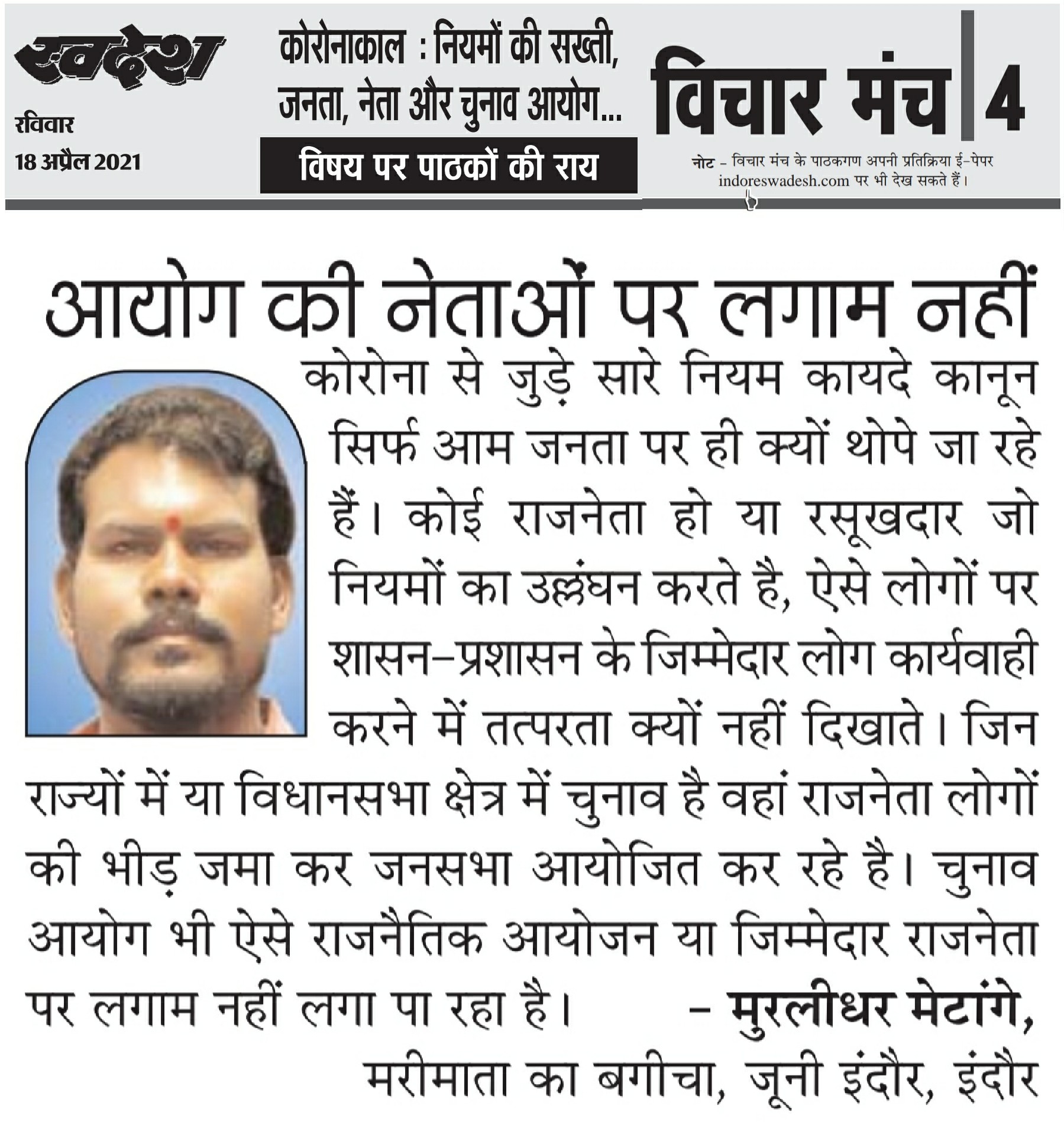 स्वदेश न्यूज़ पेपर में प्रति सप्ताह अलग-अलग विषयों पर सामाजिक कार्यकर्ता मुरलीधर राहुल मेटांगे द्वारा अपने विचार प्रकट किये गए । जो इस प्रकार है ।