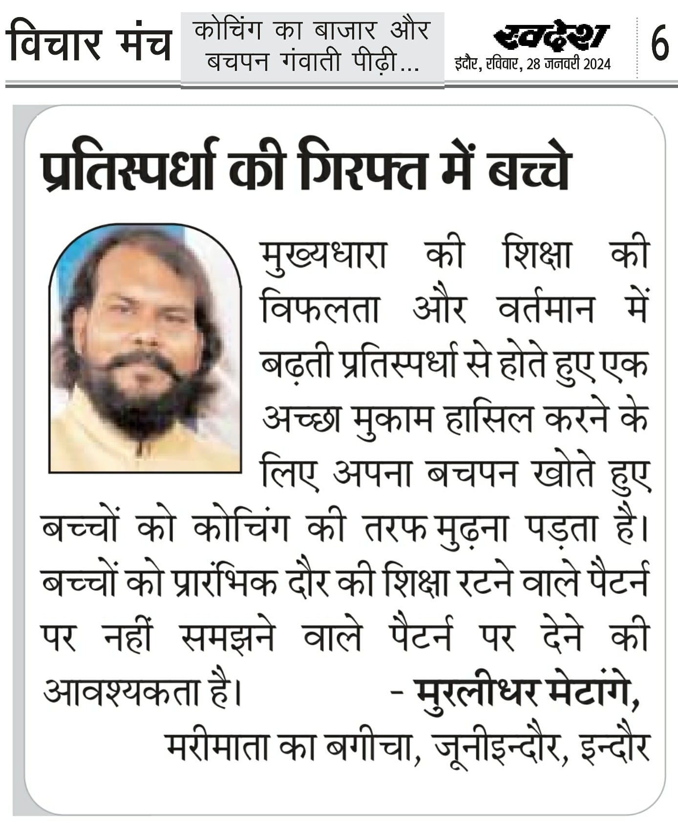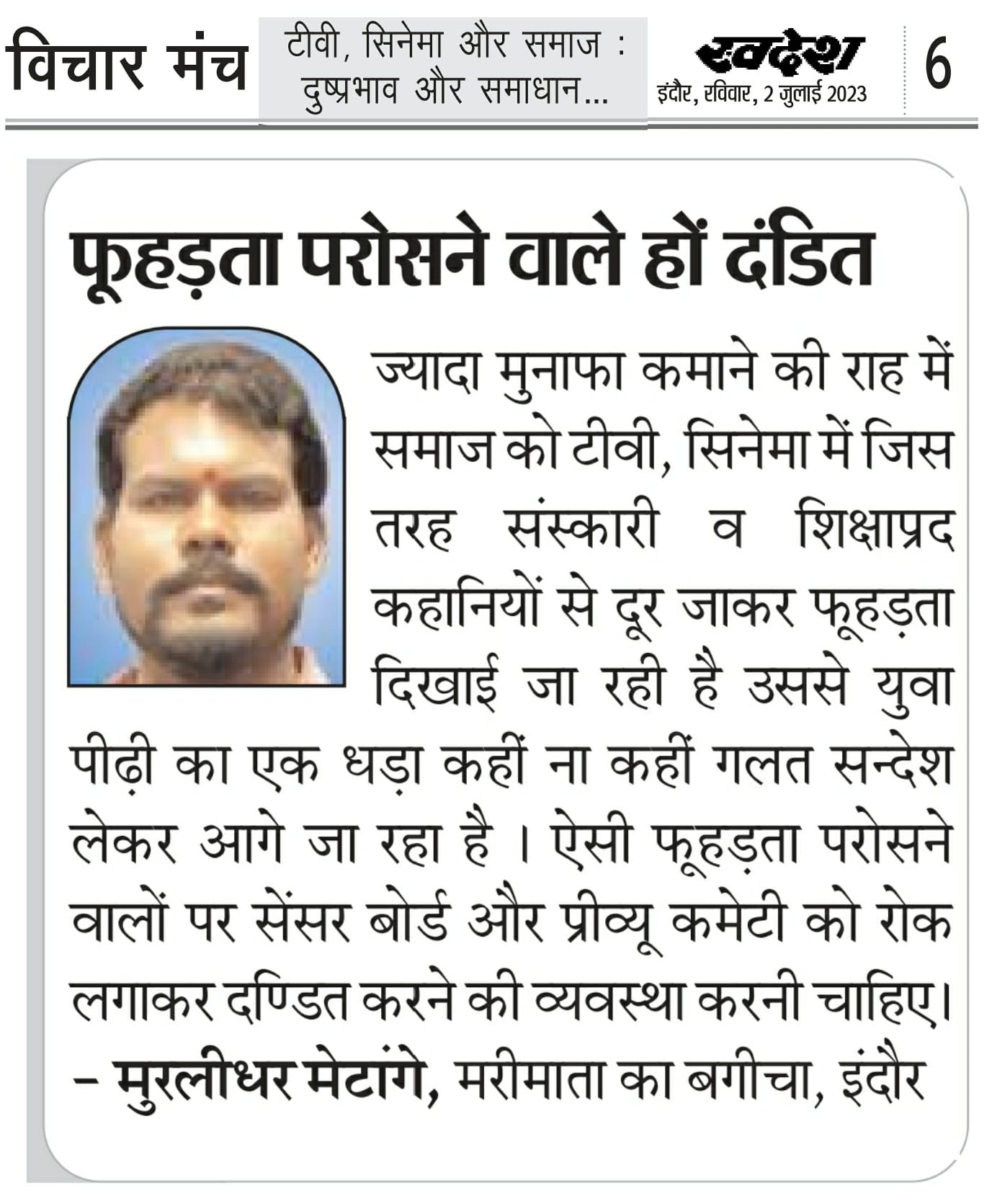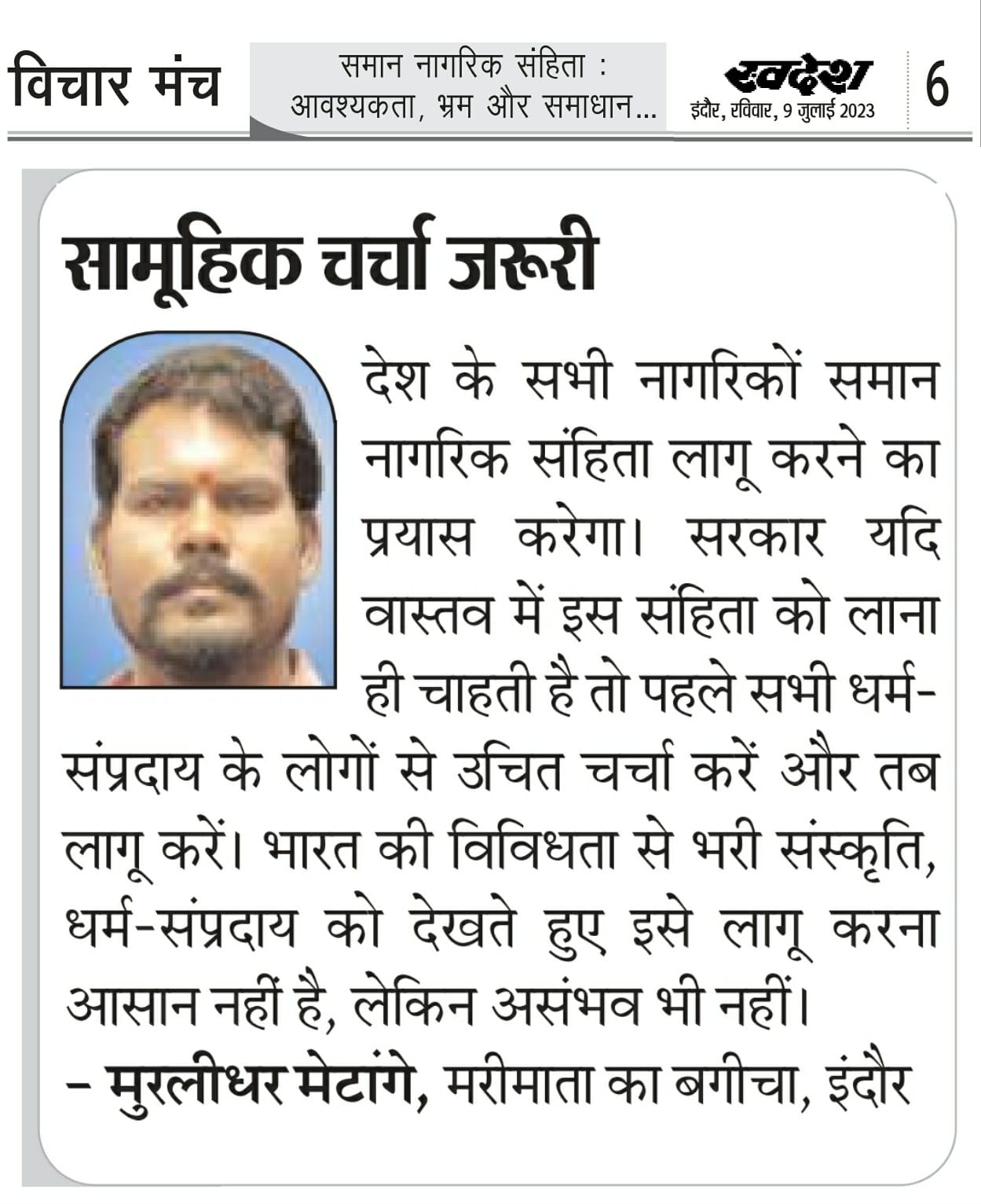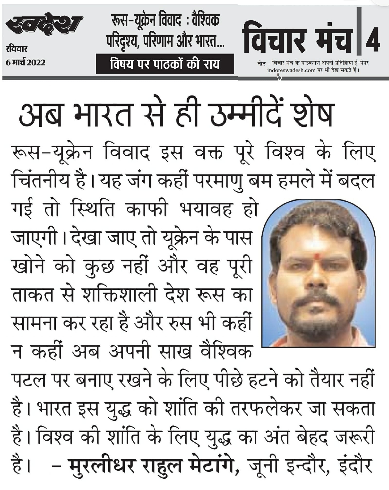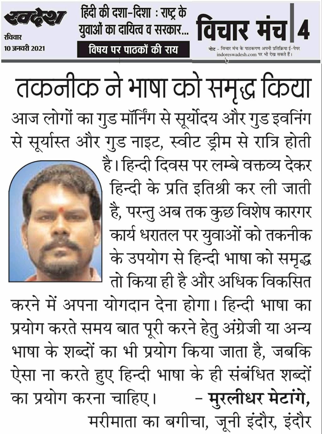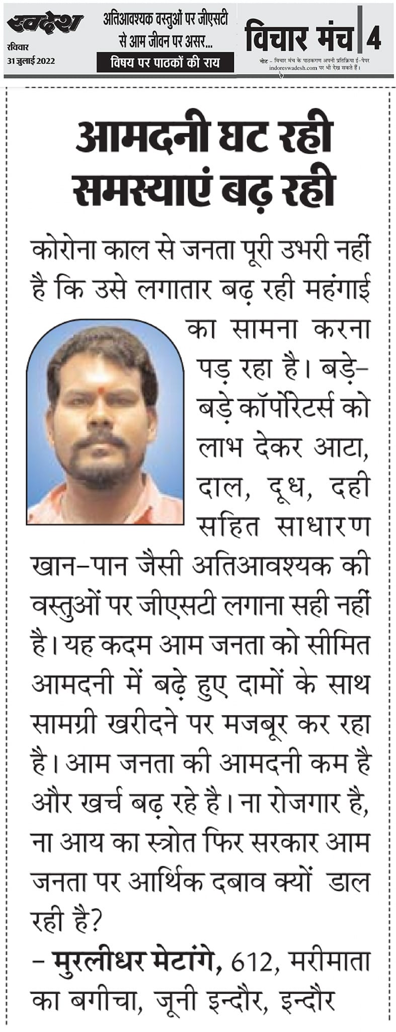 स्वदेश न्यूज़ पेपर में प्रति सप्ताह अलग-अलग विषयों पर सामाजिक कार्यकर्ता मुरलीधर राहुल मेटांगे द्वारा अपने विचार प्रकट किये गए । जो इस प्रकार है ।