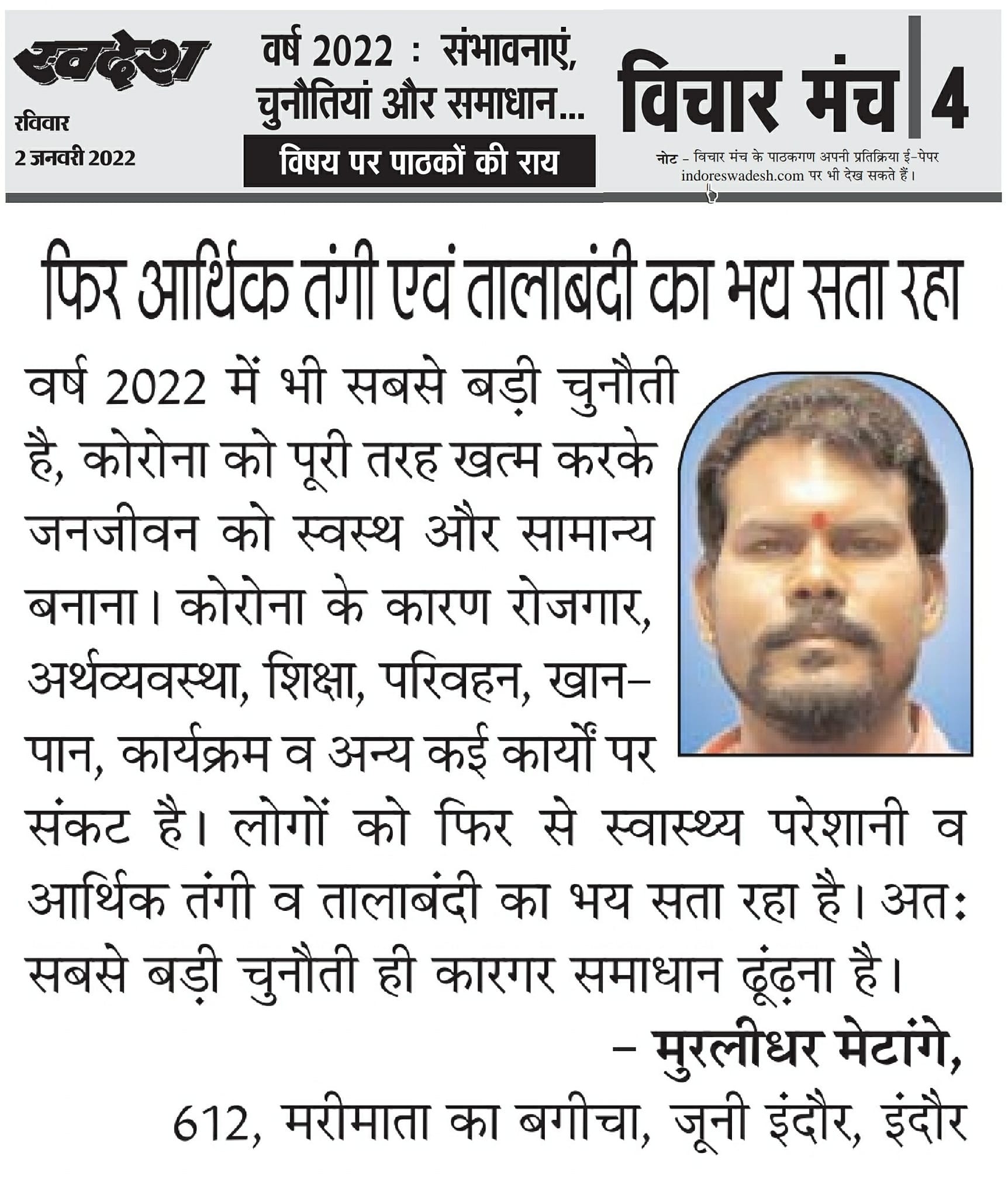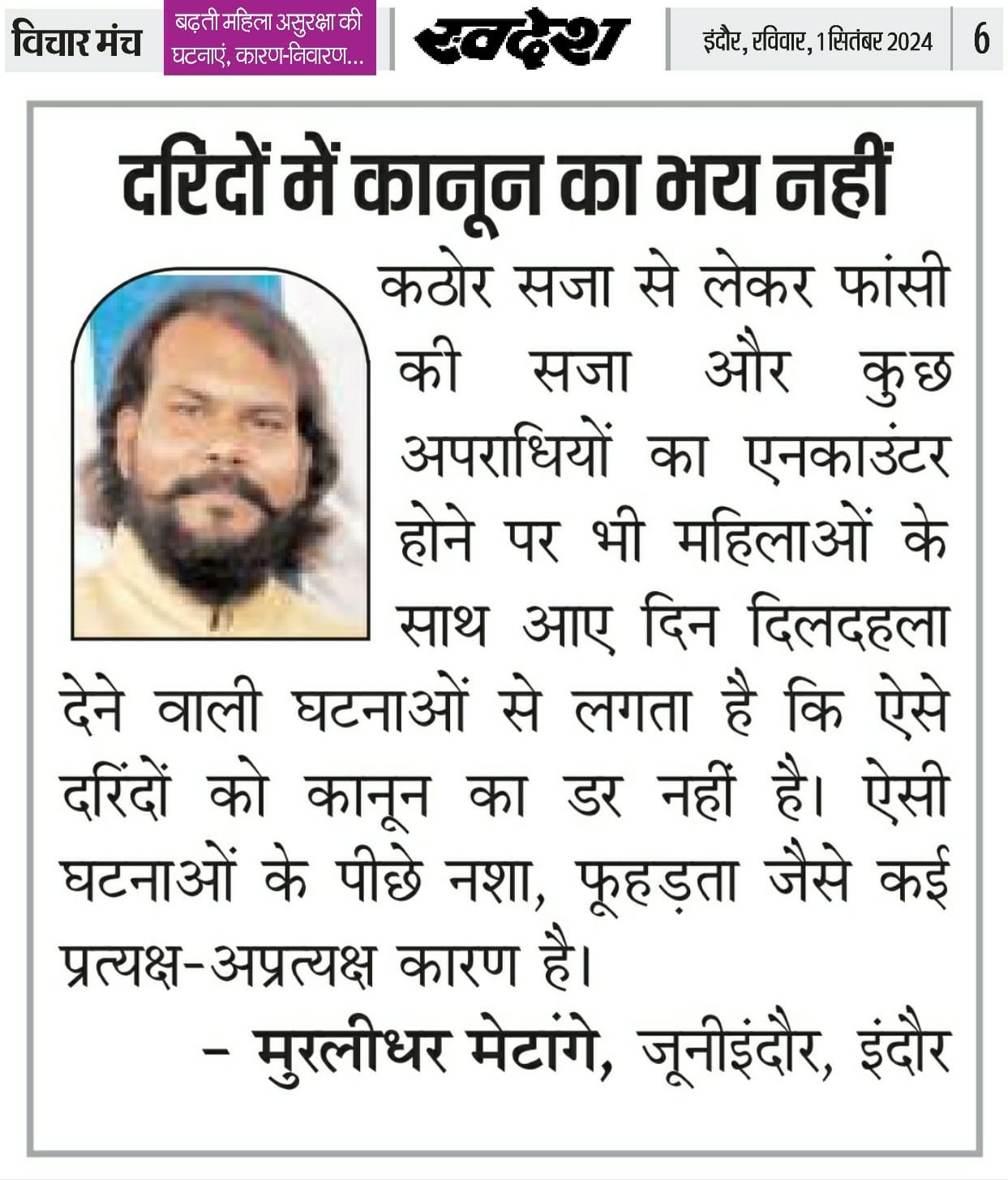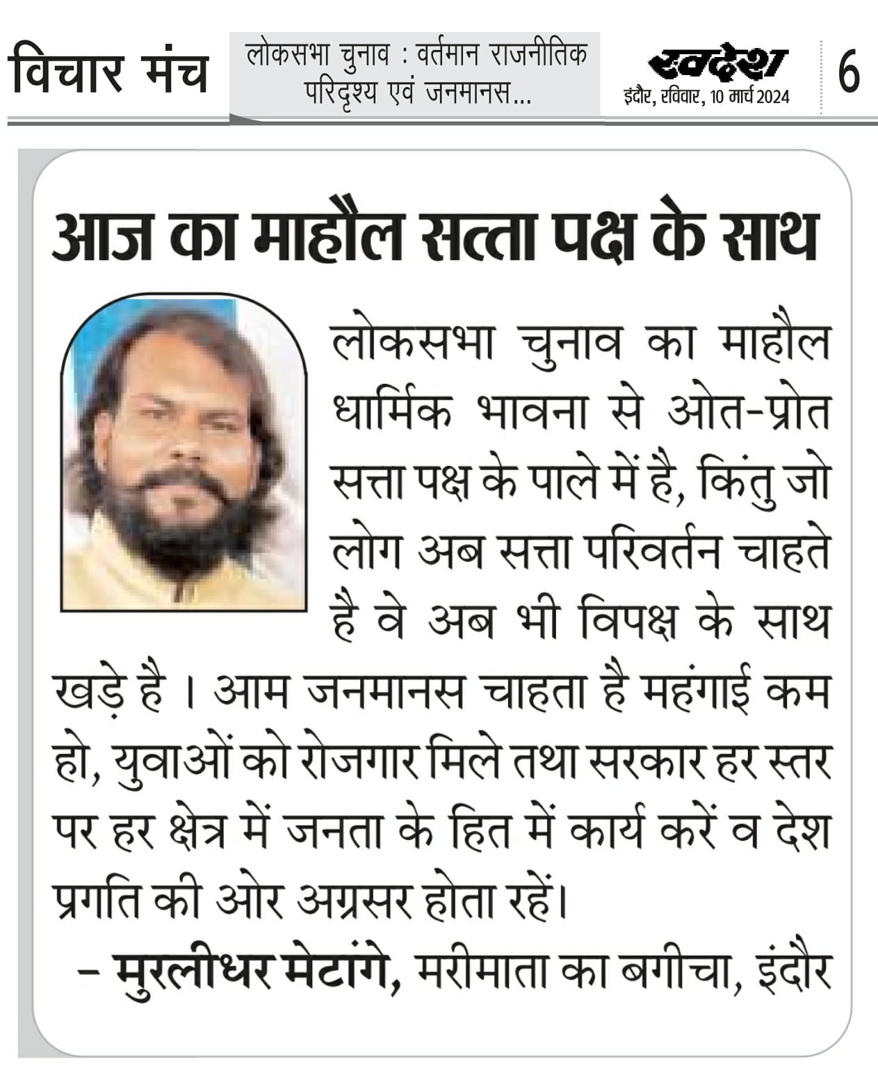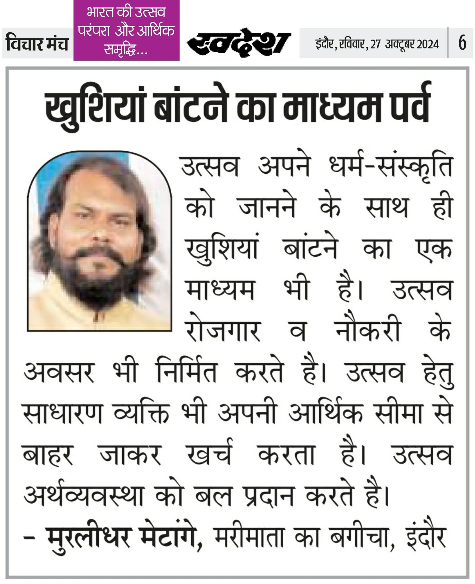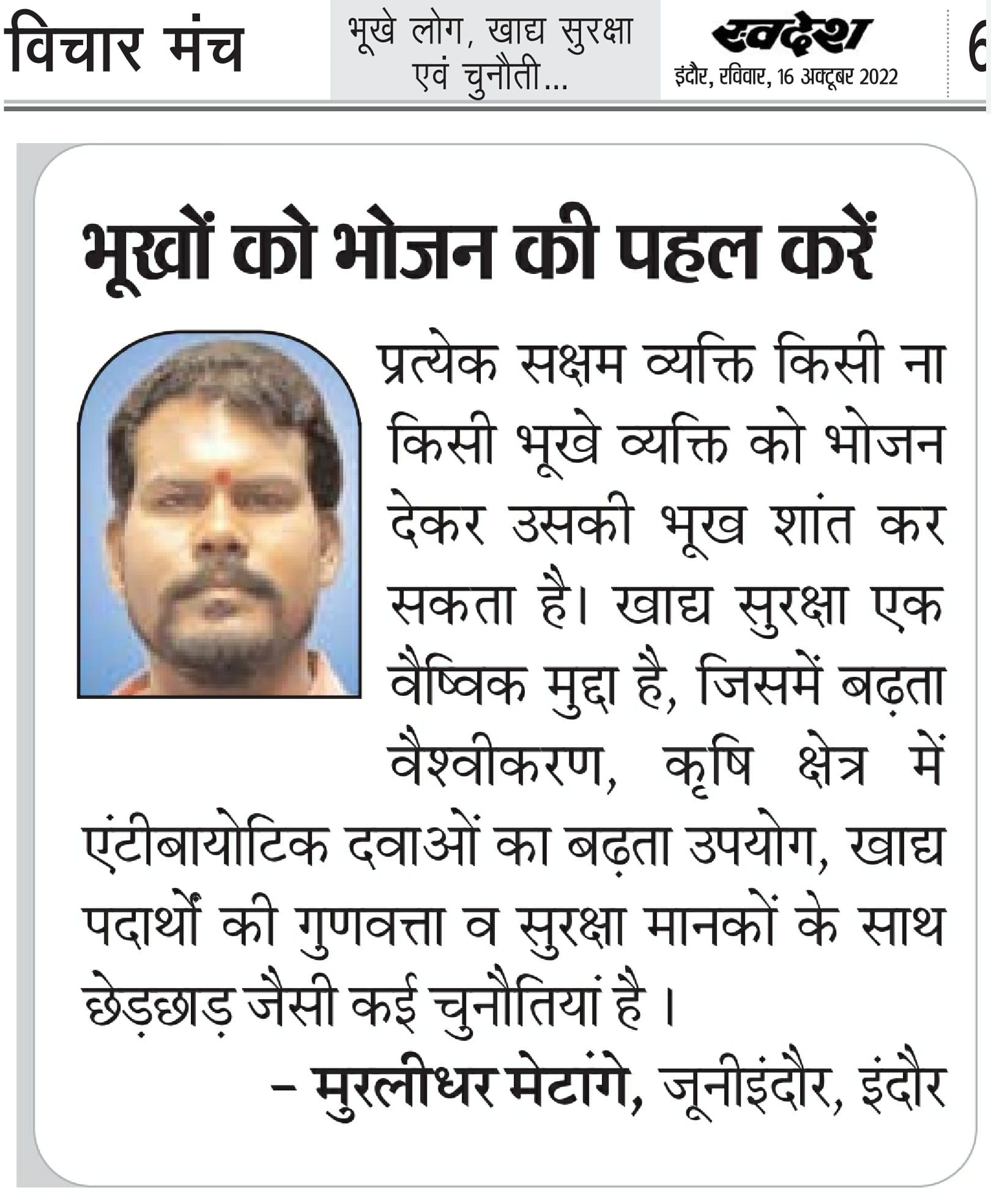 स्वदेश न्यूज़ पेपर में प्रति सप्ताह अलग-अलग विषयों पर सामाजिक कार्यकर्ता मुरलीधर राहुल मेटांगे द्वारा अपने विचार प्रकट किये गए । जो इस प्रकार है ।