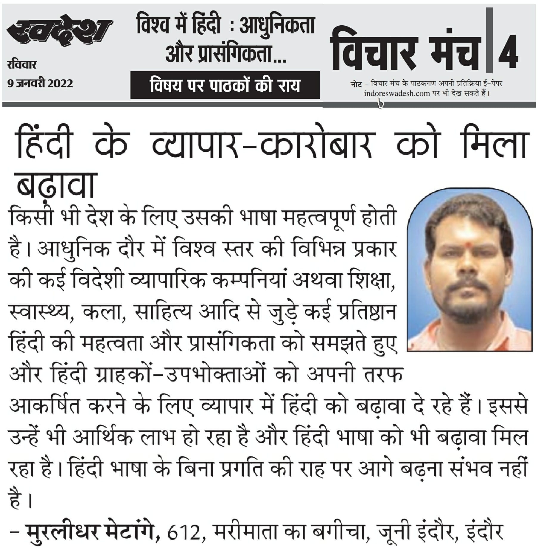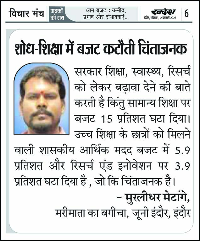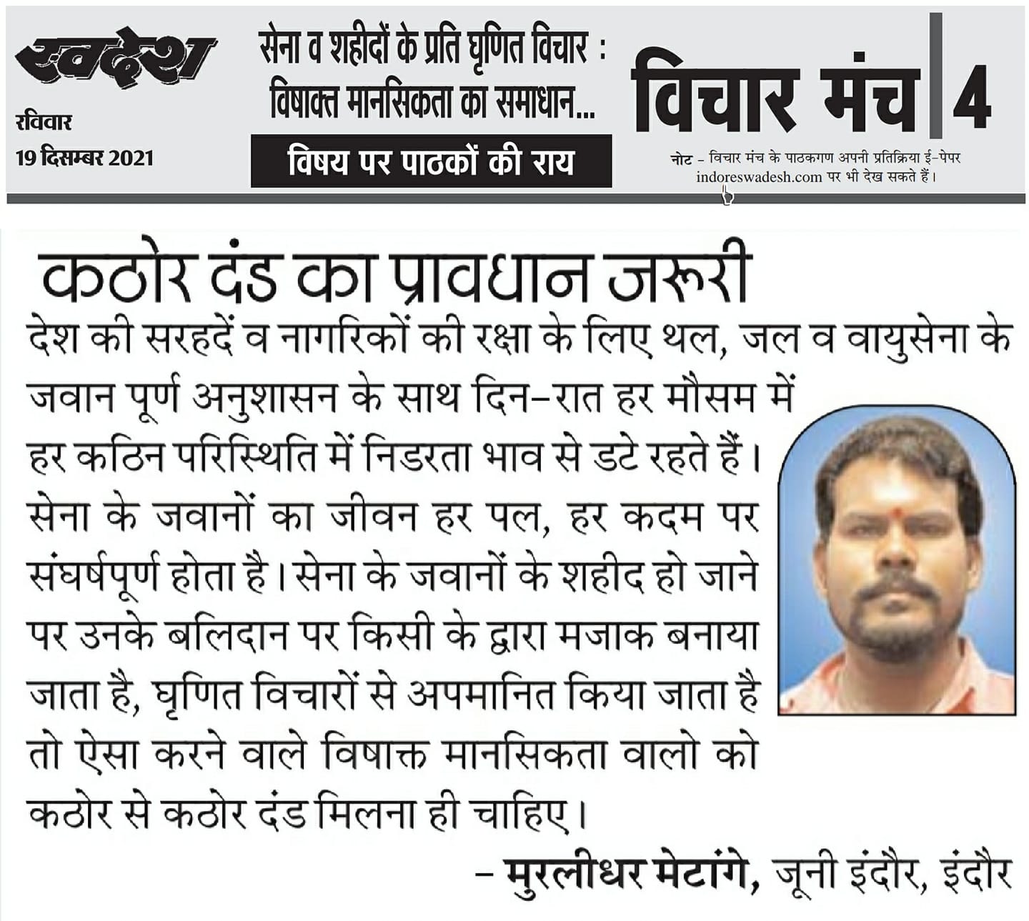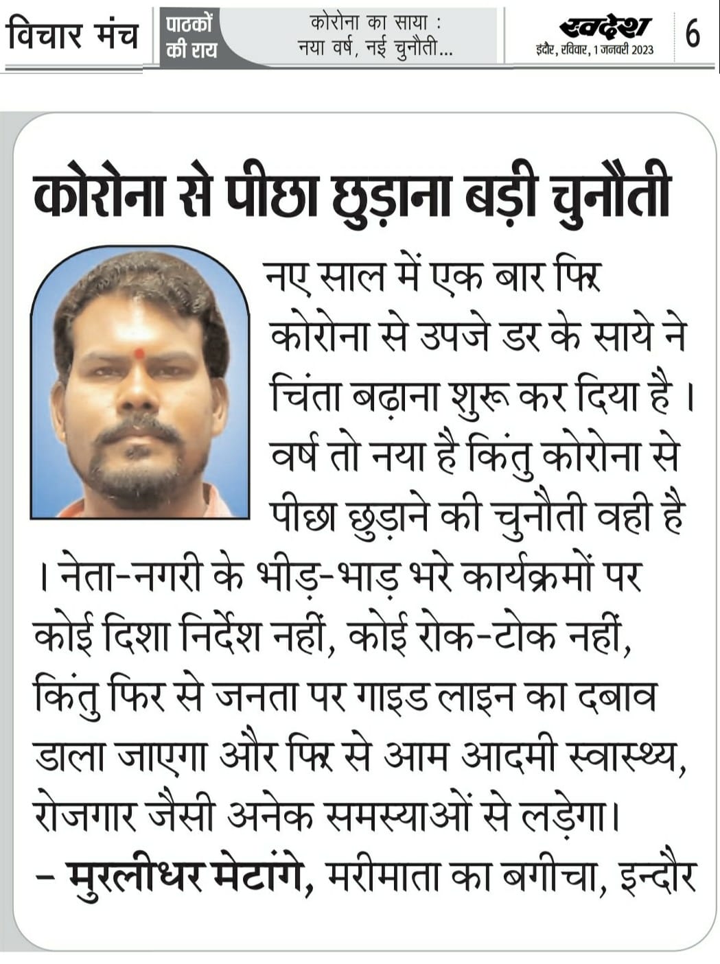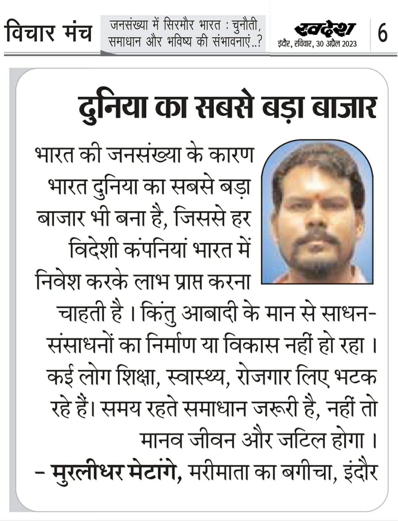 स्वदेश न्यूज़ पेपर में प्रति सप्ताह अलग-अलग विषयों पर सामाजिक कार्यकर्ता मुरलीधर राहुल मेटांगे द्वारा अपने विचार प्रकट किये गए । जो इस प्रकार है ।
